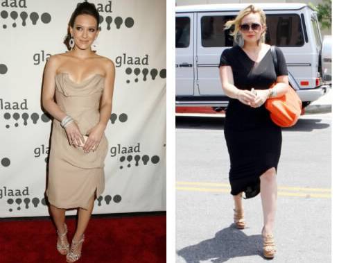 Hilary Duff a sinistra in una foto del 2007. A destra in una foto del 2012, visibilmente ingrassata a seguito della sua prima gravidanzaHilary Duff a sinistra in una foto del 2007. A destra in una foto del 2012, visibilmente ingrassata a seguito