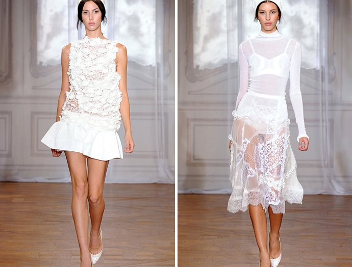 La varietà comunque preferita in assoluto è il pizzo bianco con motivo floreale: un pizzo che ricorda la tovaglia della festa, quella che si usa solo in occasioni veramente speciali. Ma la particolarità di questa stagione è che questo tipo di pizzo, considerato in genere un po’ superato e tradizionalmente da sposa, in mano a stilisti come Marni, che lo spezza con stravaganti stampe floreali, come Giambattista Valli che lo accosta a pezzi argento, o come Louis Vuitton, che lo mescola alle piume, riesce a reinverntarsi con un’immagine fresca e non convenzionale. E anche quando è utilizzato in toni più scuri, anche in nero, come da Dolce & Gabbana, è rinnovato da applicazioni di fiori tridimensionali in tessuto luminoso.
