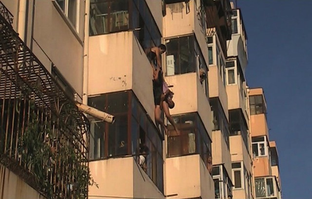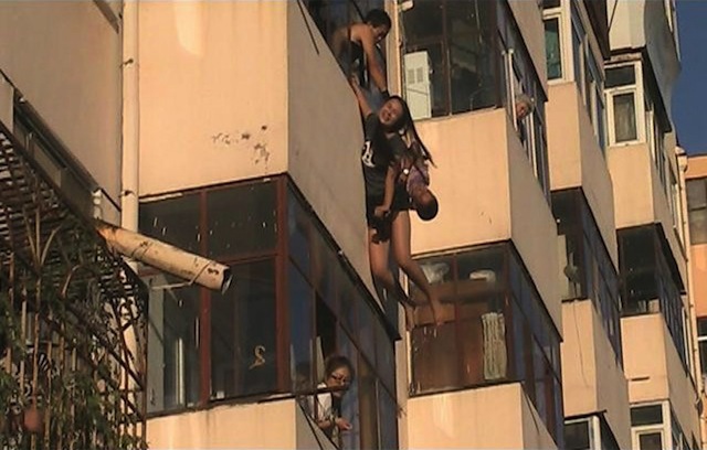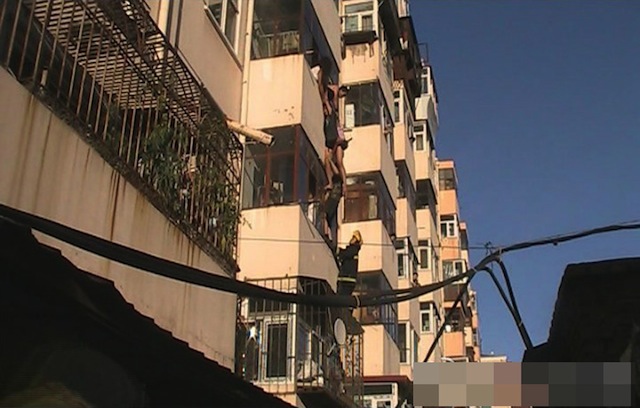 HARBIN (CINA) – Afferrare gente che cade dal balcone per prevenire suicidi sembra essere una pratica abbastanza diffusa in Cina. Le foto mostrano come una donna di 20 anni residente ad Harbin, nella Cina nord-orientale, è stata salvata da morte certa da un uomo che viveva al piano di sotto. La giovane donna era caduta dal balcone del suo appartamento al quinto piano in seguito ad un litigio con il fidanzato. Fortunatamente, l’uomo è riuscito ad afferrarla per il braccio e spingerla in casa con l’aiuto dei pompieri.