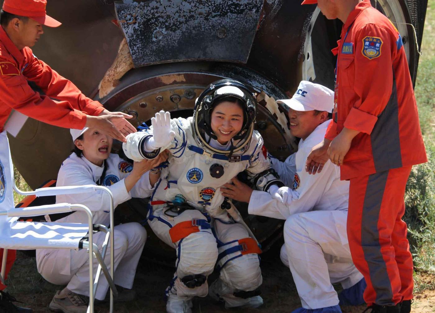 SIZIWANG, June 29, 2012 Chinese female astronaut Liu Yang waves to crowds while coming out of the re-entry capsule of Shenzhou-9 spacecraft in Siziwang Banner of north China's Inner Mongolia Autonomous Region. (Credit Image: © Wang Jianmin/Xinhua/ZUMAPRESS.com)