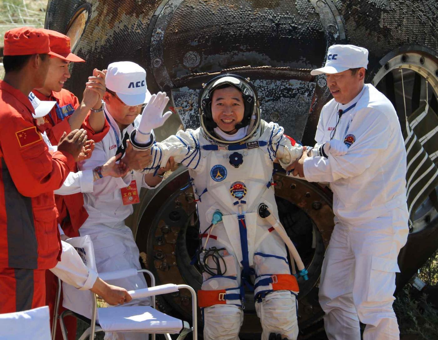 SIZIWANG, June 29, 2012 Chinese astronaut Jing Haipeng waves after coming out of the re-entry capsule of Shenzhou-9 spacecraft in Siziwang Banner of north China's Inner Mongolia Autonomous Region, on June 29, 2012. (Credit Image: © Wang Jianmin/Xinhua/ZUMAPRESS.com)