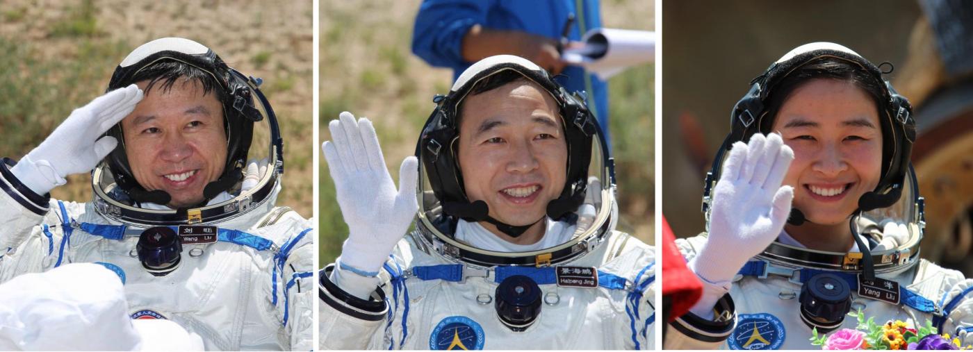 SIZIWANG, June 29, 2012 Chinese astronauts Jing Haipeng (C), Liu Wang (L) and Liu Yang (R) wave after coming out of the re-entry capsule of Shenzhou-9 spacecraft in Siziwang Banner of north China's Inner Mongolia Autonomous Region, on June 29, 2012. (Credit Image: © Wang Jianmin/Xinhua/ZUMAPRESS.com)