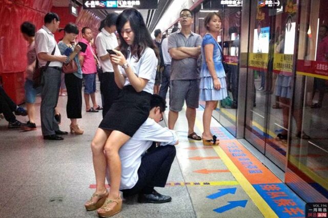 GUANGZHOU (CINA) – Per rendere l’attesa del treno più comoda, un ragazzo cinese ha permesso alla sua ragazza di sedersi sulla sua schiena, diventando cosi la sua sedia. Grazie all’amore incondizionato del suo uomo, la ragazza ha potuto continuare a mandare messaggi alle sue amiche. La foto, apparsa sulla pagina Facebook di chinaSMACK e ripresa da diversi siti stranieri, è stata scattata nella metro di Guangzhou.