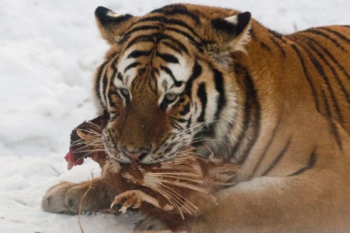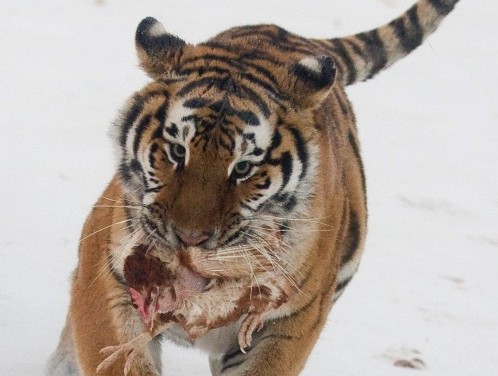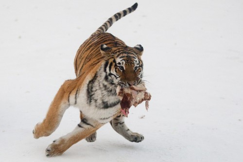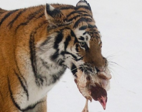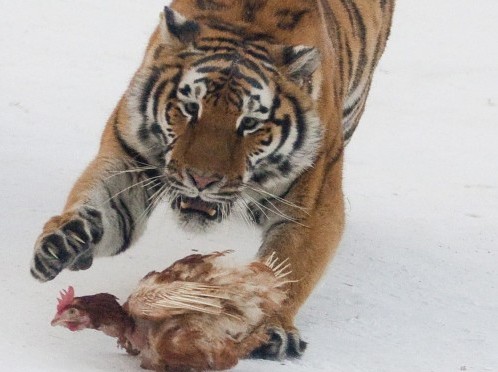 Questa tigre siberiana con un pollo in bocca, vive nel parco delle tigri siberiane di Harbin, città della provincia di Heilongjiang nel nord della Cina.