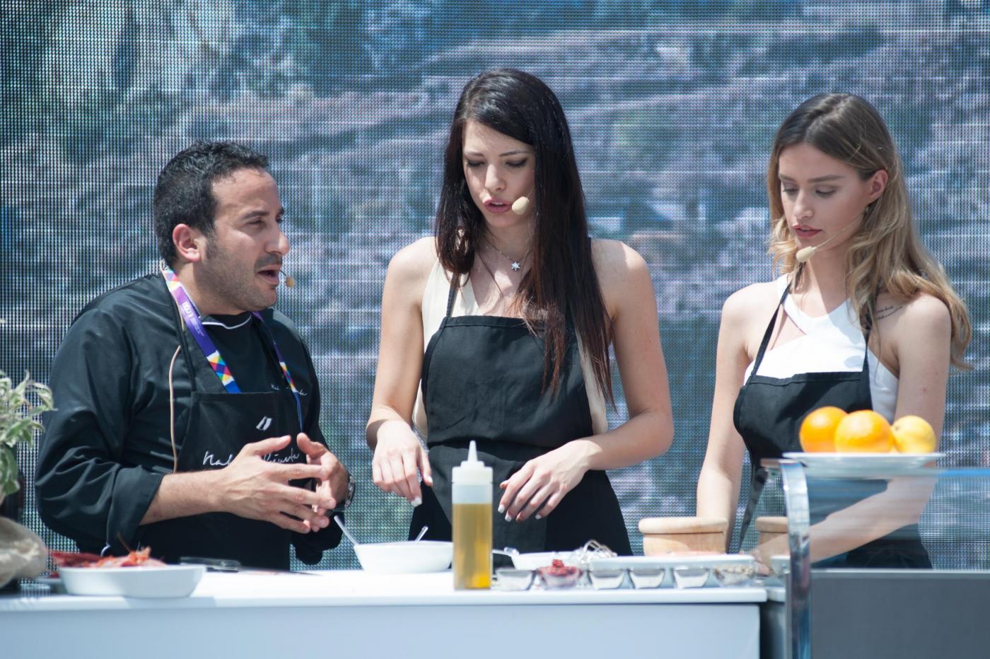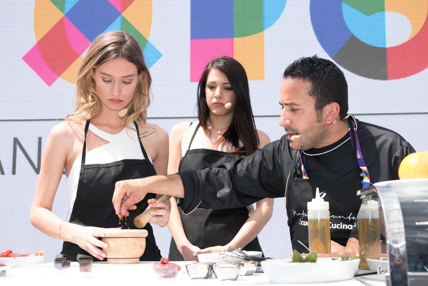 Foto Piero Cruciatti / LaPresse 18-05-2015 Milano, Italia Spettacolo Showcooking con le due Miss Italia, Clarissa Marchese e Giulia Arena a Expo 2015 Nella Foto: Chef Natale Giunta ,Miss Italia Clarissa Marchese and Giulia Arena Photo Piero Cruciatti / LaPresse 18-05-2015 Milan, Italy Entertainment Showcooking with Miss Italia, Clarissa Marchese and Giulia Arena at Expo 2015 In the Photo: Chef Natale Giunta ,Miss Italia Clarissa Marchese and Giulia Arena
