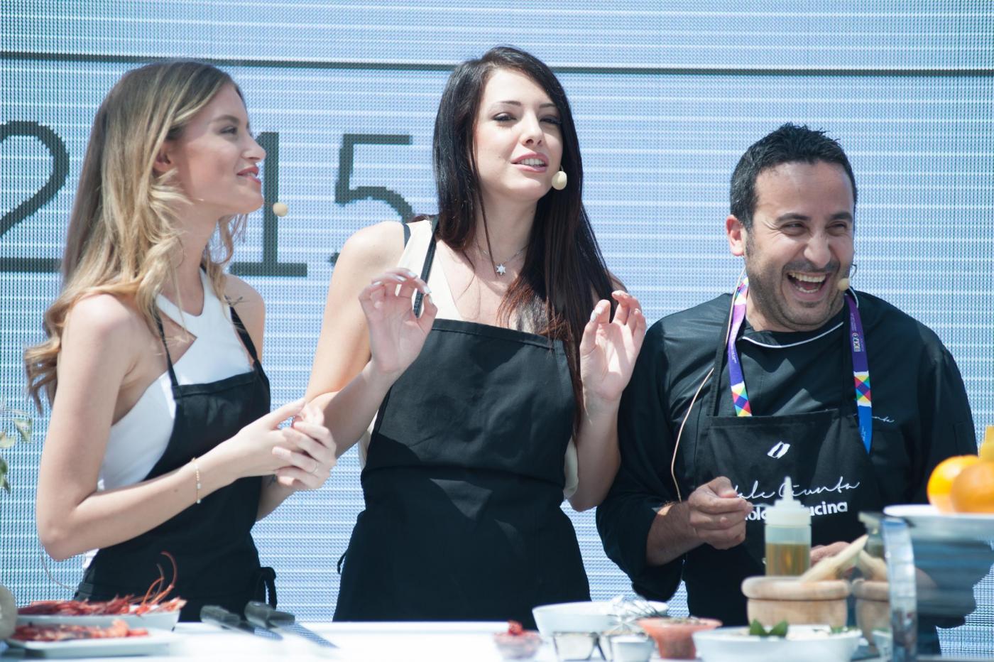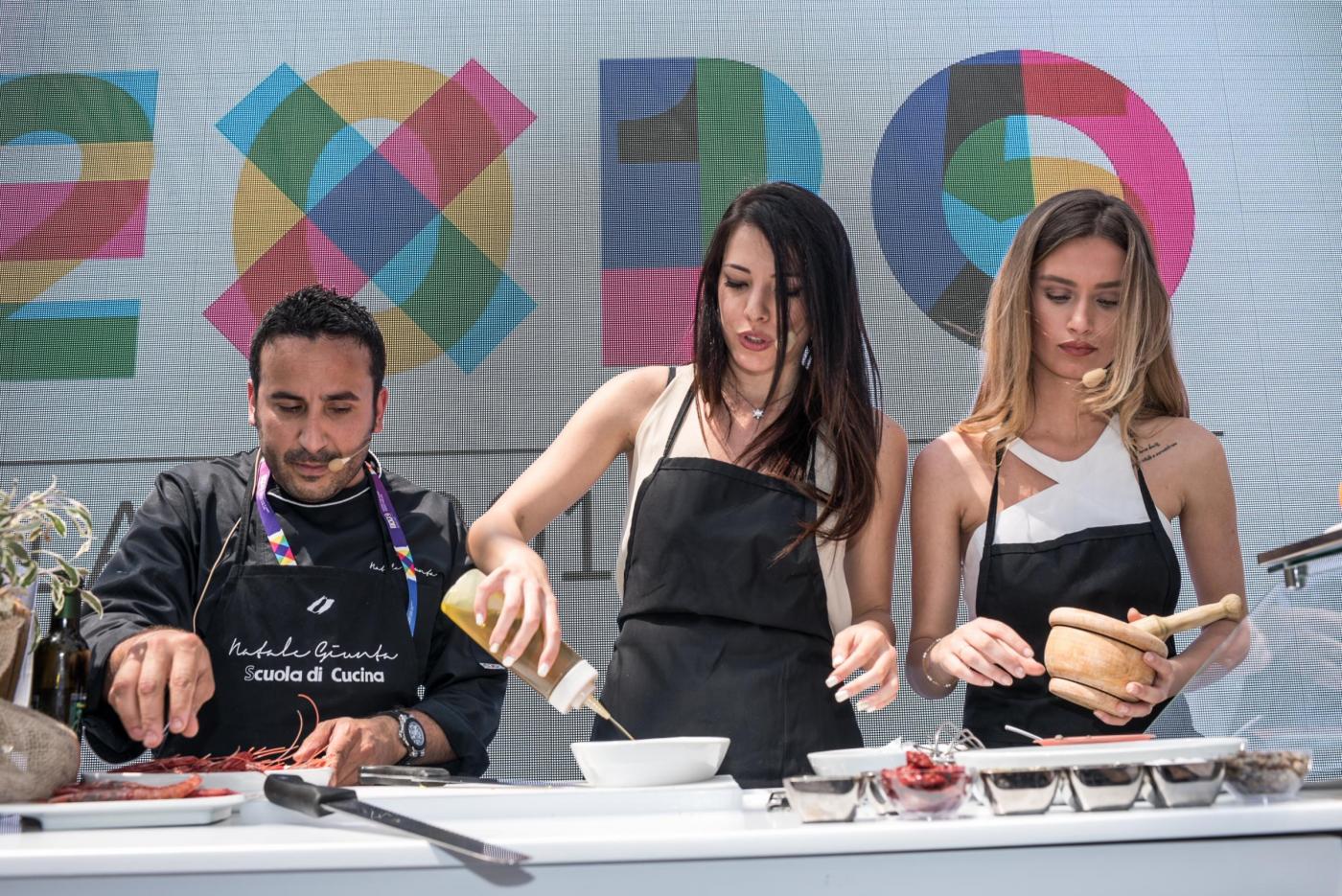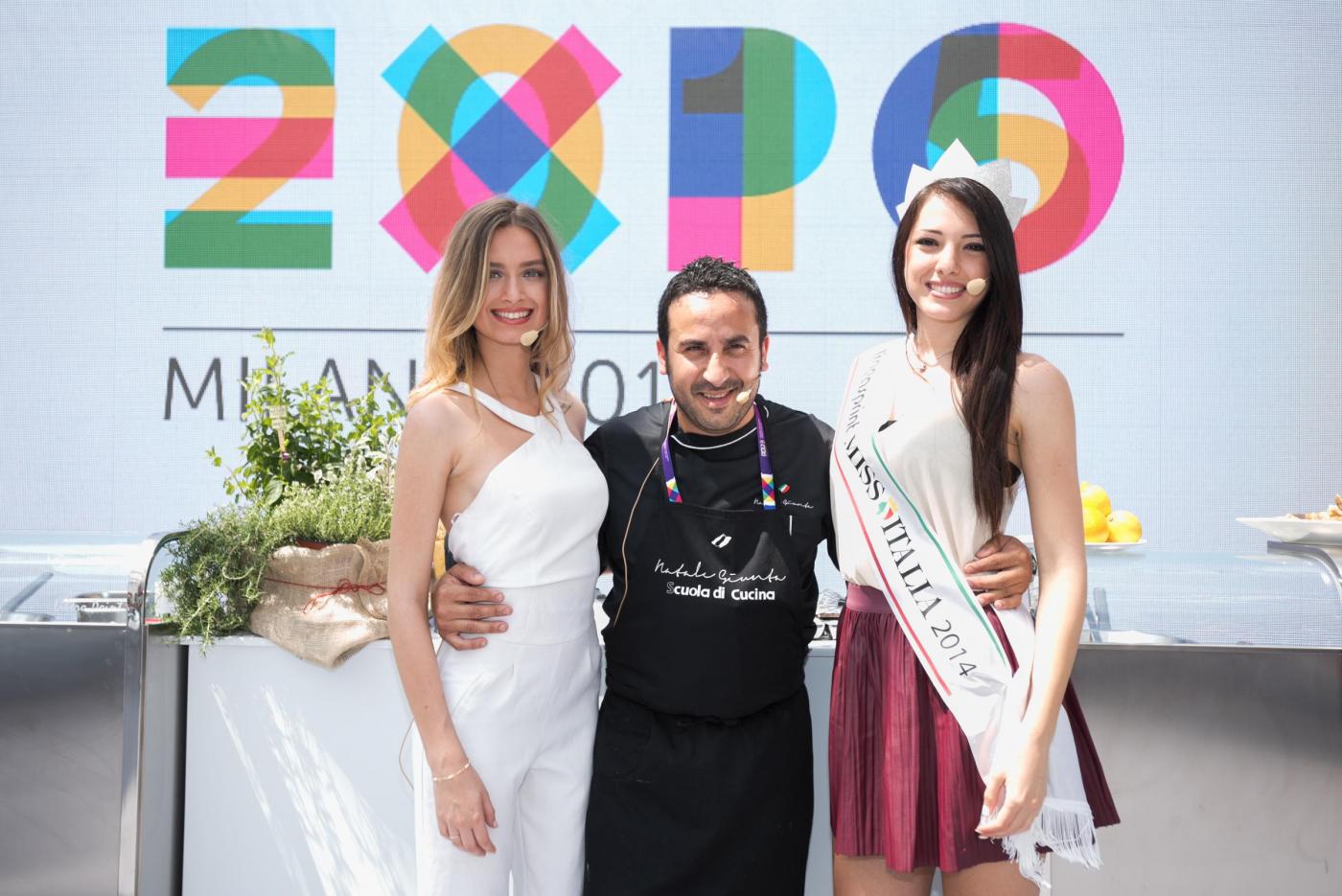 Foto Piero Cruciatti / LaPresse 18-05-2015 Milano, Italia Spettacolo Showcooking con le due Miss Italia, Clarissa Marchese e Giulia Arena a Expo 2015 Nella Foto: Miss Italia Clarissa Marchese, Giulia Arena e Chef Natale Giunta Photo Piero Cruciatti / LaPresse 18-05-2015 Milan, Italy Entertainment Showcooking with Miss Italia, Clarissa Marchese and Giulia Arena at Expo 2015 In the Photo: Miss Italia Clarissa Marchese, Giulia Arena and Chef Natale Giunta