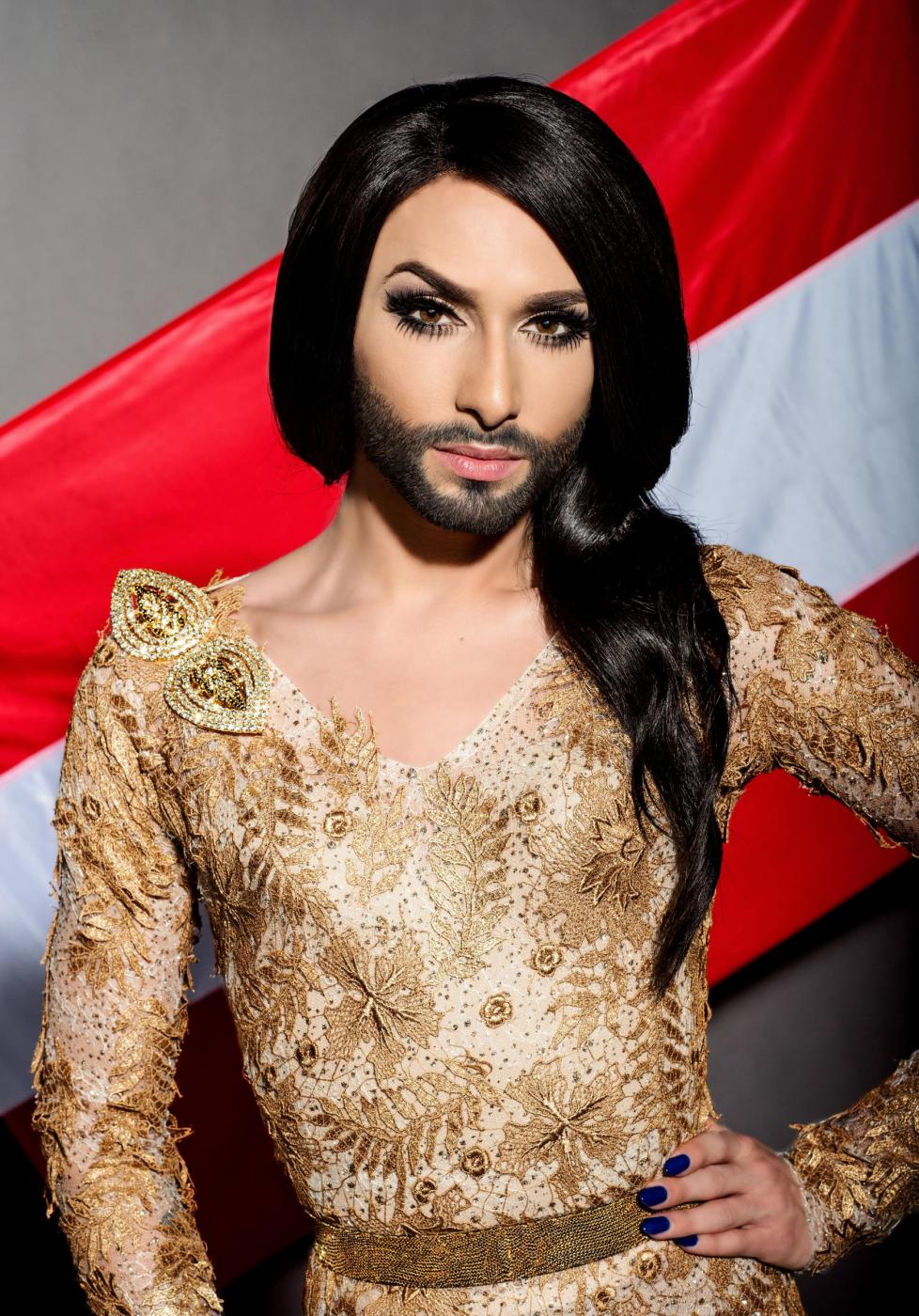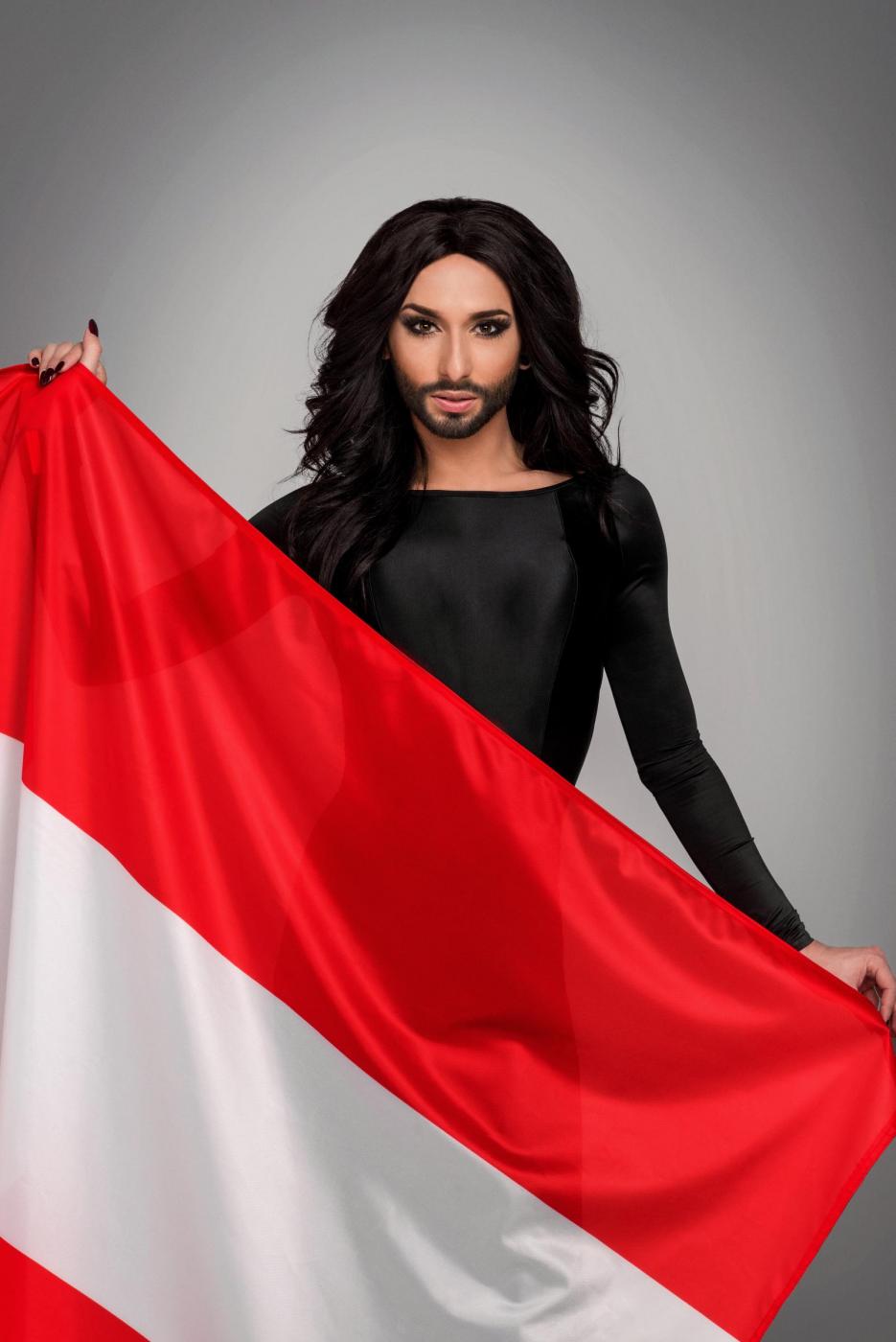 Conchita oggi (LaPresse) Conchita Wurst alias Thomas (Tom) Neuwirth bei einem Fototermin in Wien vor der sterreichischen Fahne anlsslich ihrer Teilnahme beim Eurovision Song Contest 2014 in Kopenhagen / 070414 *** Conchita aka Thomas (Tom) Neuwirth during a photo shoot in Vienna, April 07, 2014 *** Conchita Wurst, la trasformazione della drag Queen vincitrice dell'Eurovision Song Contest ActionLaPresse -- Only Italy *** Local Caption *** 18512642