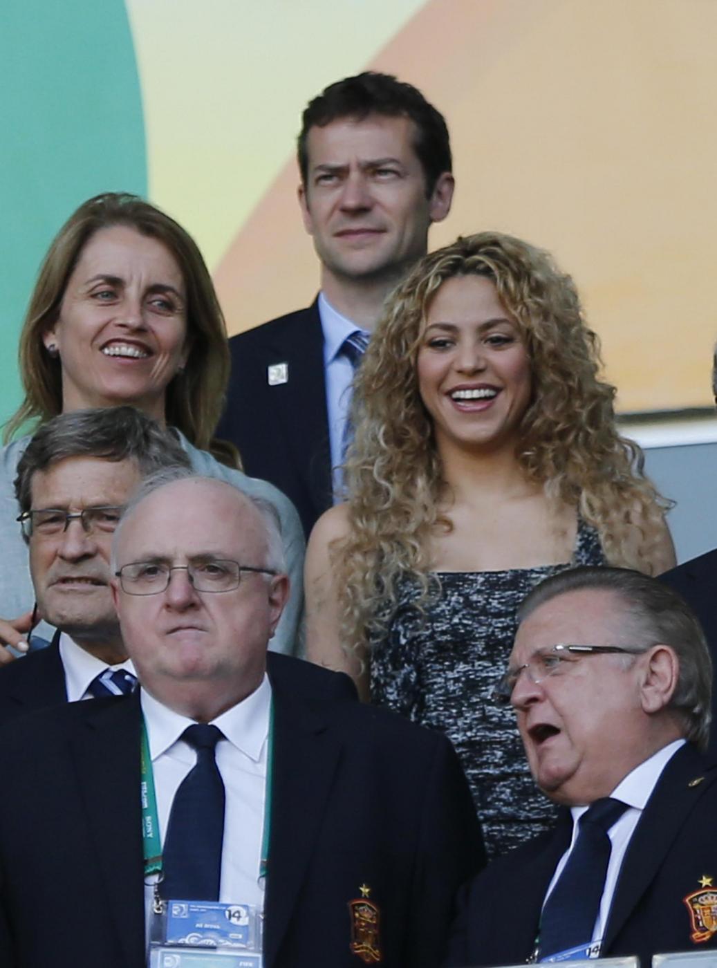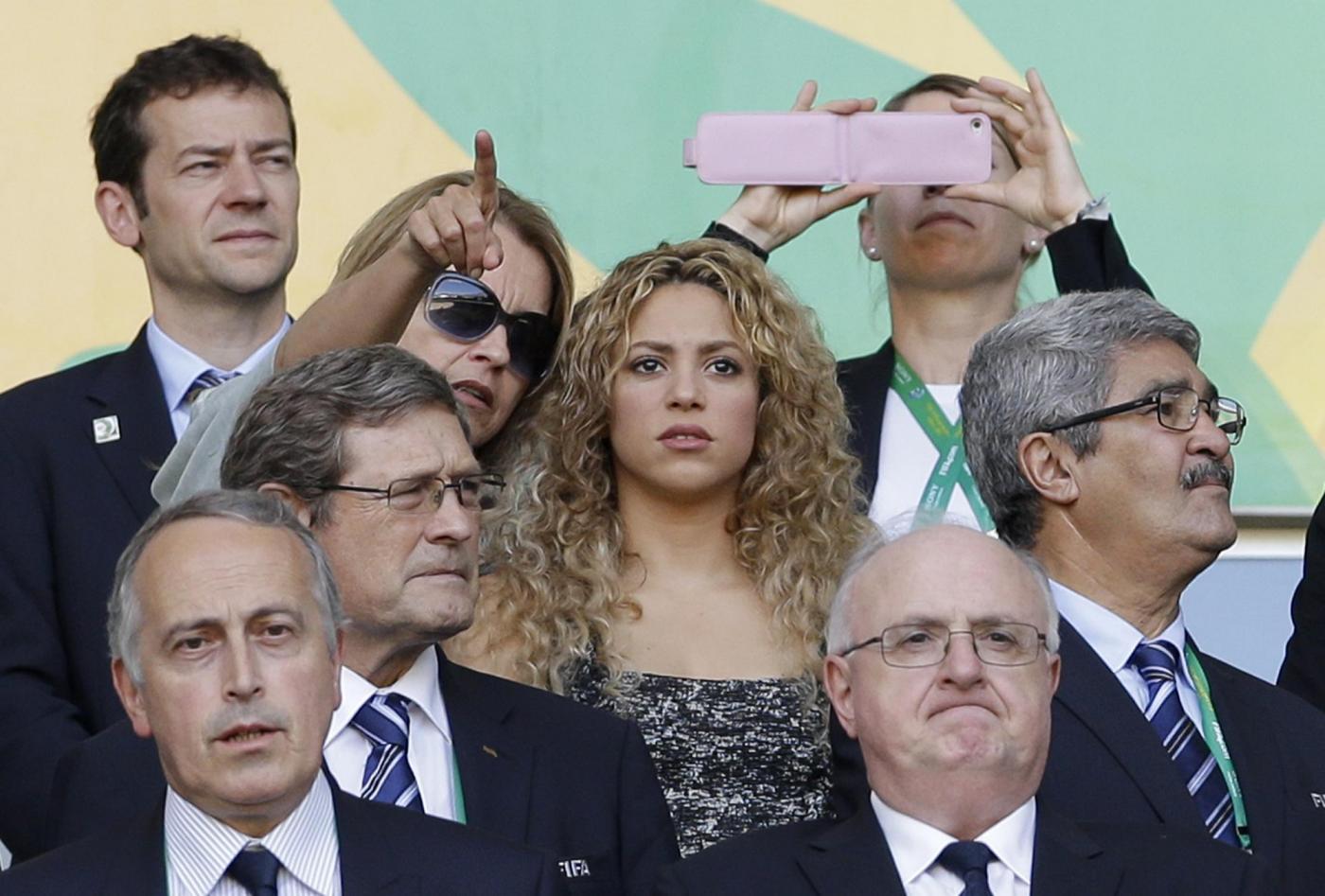 Colombian singer Shakira watches the soccer Confederations Cup semifinal match between Spain and Italy at Castelao stadium in Fortaleza, Brazil, Thursday, June 27, 2013. (AP Photo/Fernando Llano)