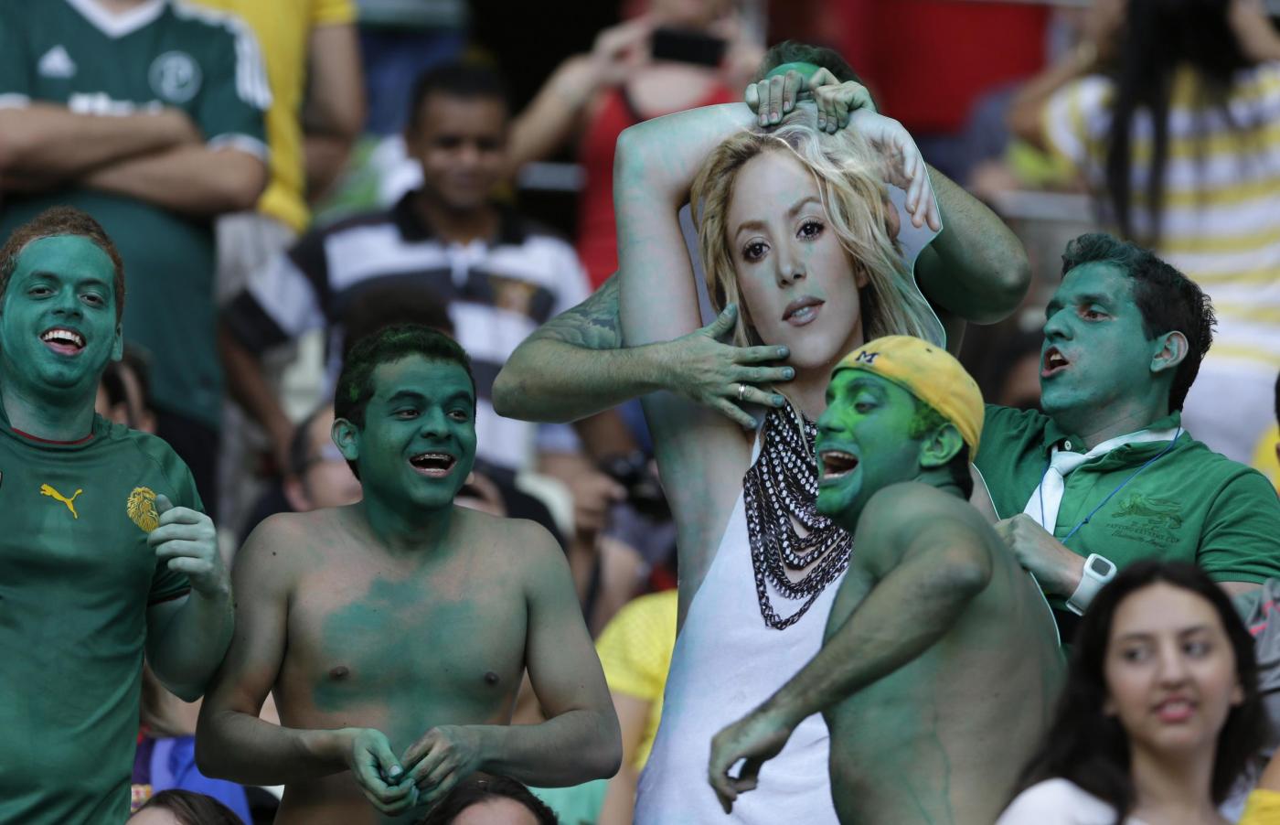 Soccer fans hold a poster of Colombian popstar Shakira the wife of Spain's Gerard Pique during the soccer Confederations Cup group B match between Nigeria and Spain at the Castelao stadium in Fortaleza, Brazil, Sunday, June 23, 2013. (AP Photo/Natacha Pisarenko)