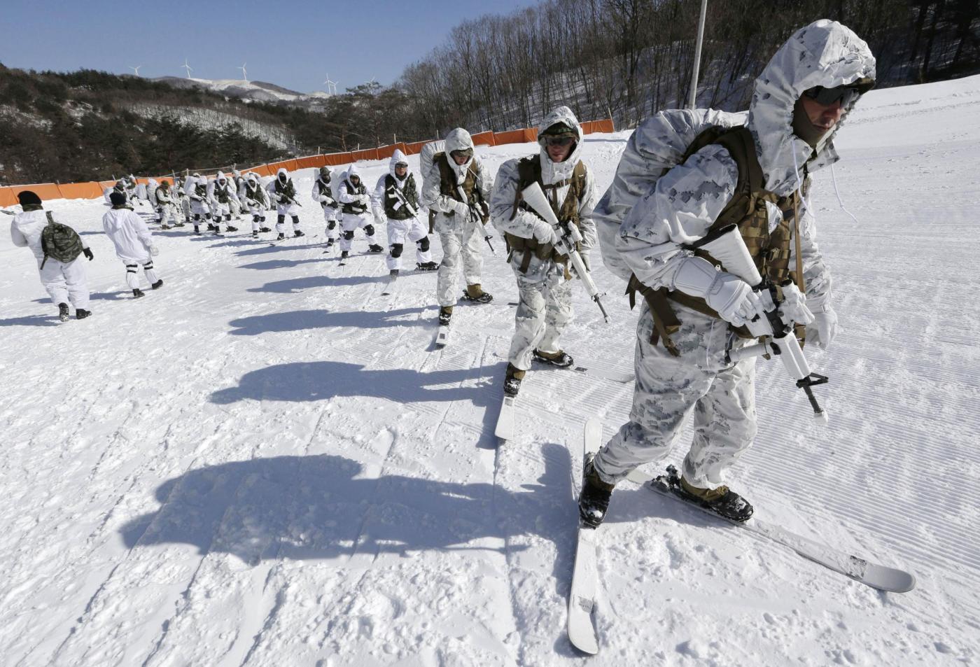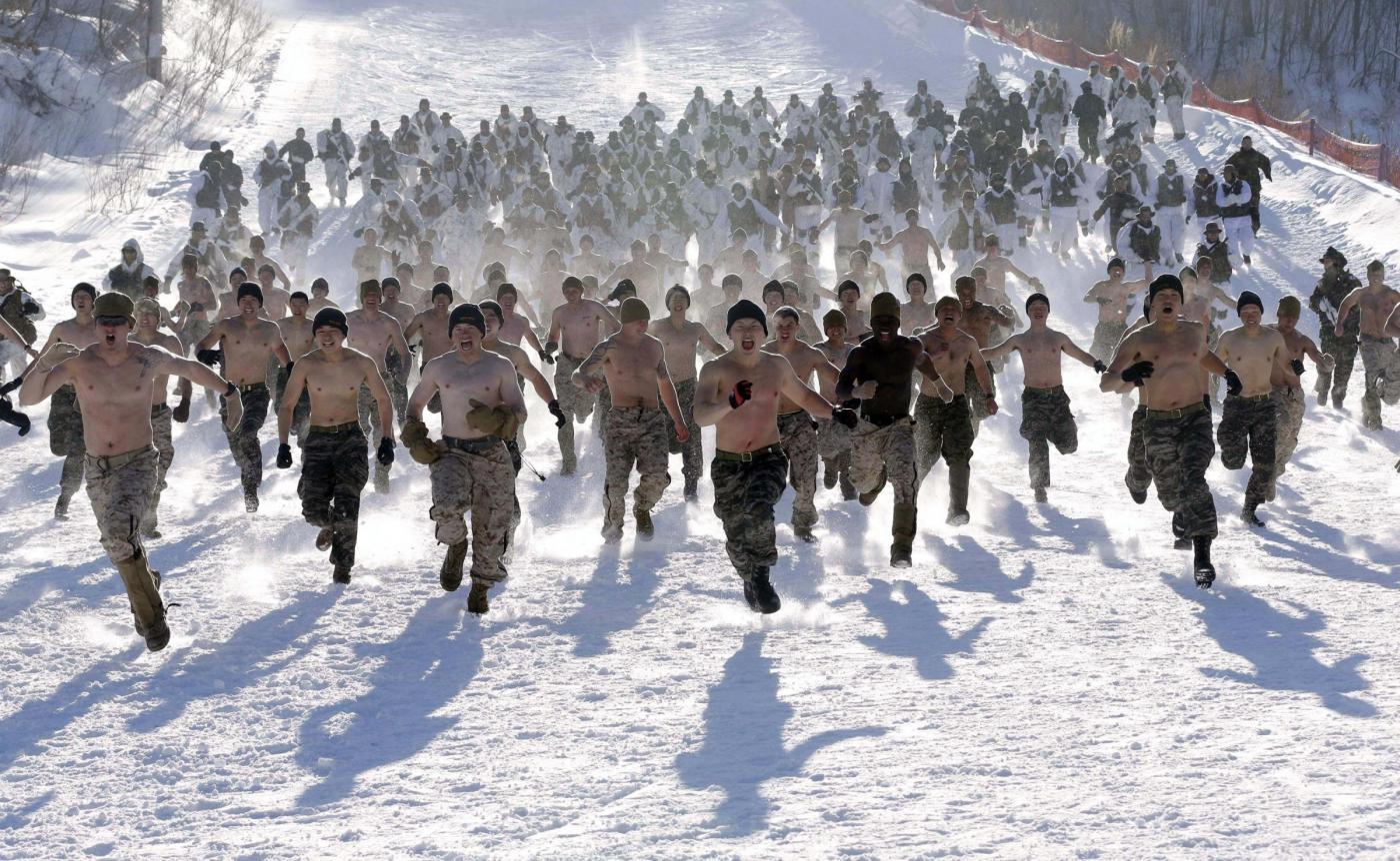 SEUL (COREA DEL SUD) – Queste immagini mostrano alcuni marines sudcoreani che si allenano sulla neve insieme a dei colleghi americani. Siamo in un campo militare della contea di Pyeongchang a est di Seul.