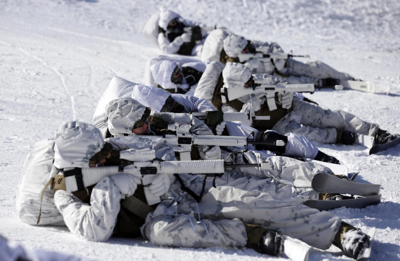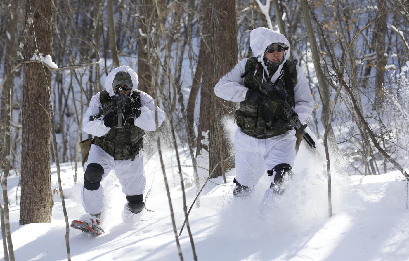 Le foto sono state scattate giovedì 7 febbraio: a questa prima esercitazione congiunta tra i due paesi, hanno partecipato circa 400 militari. L’addestramento è molto duro: alcuni di loro vengono fatti correre a torso nudo sulla neve (foto Ap/LaPresse)