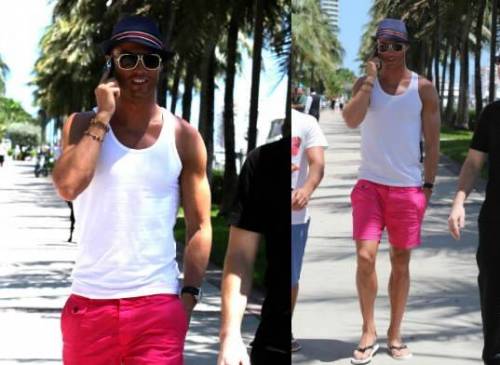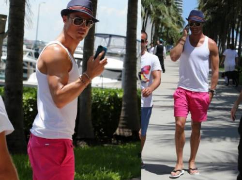 MIAMI – Pantaloncini rosa, canotta bianca, cappello e occhiali da sole. Il look non è di quelli più azzeccati per Crisitano Ronaldo, che è stato paparazzato in quel di Miami mentre si gode alcuni giorni di relax.
