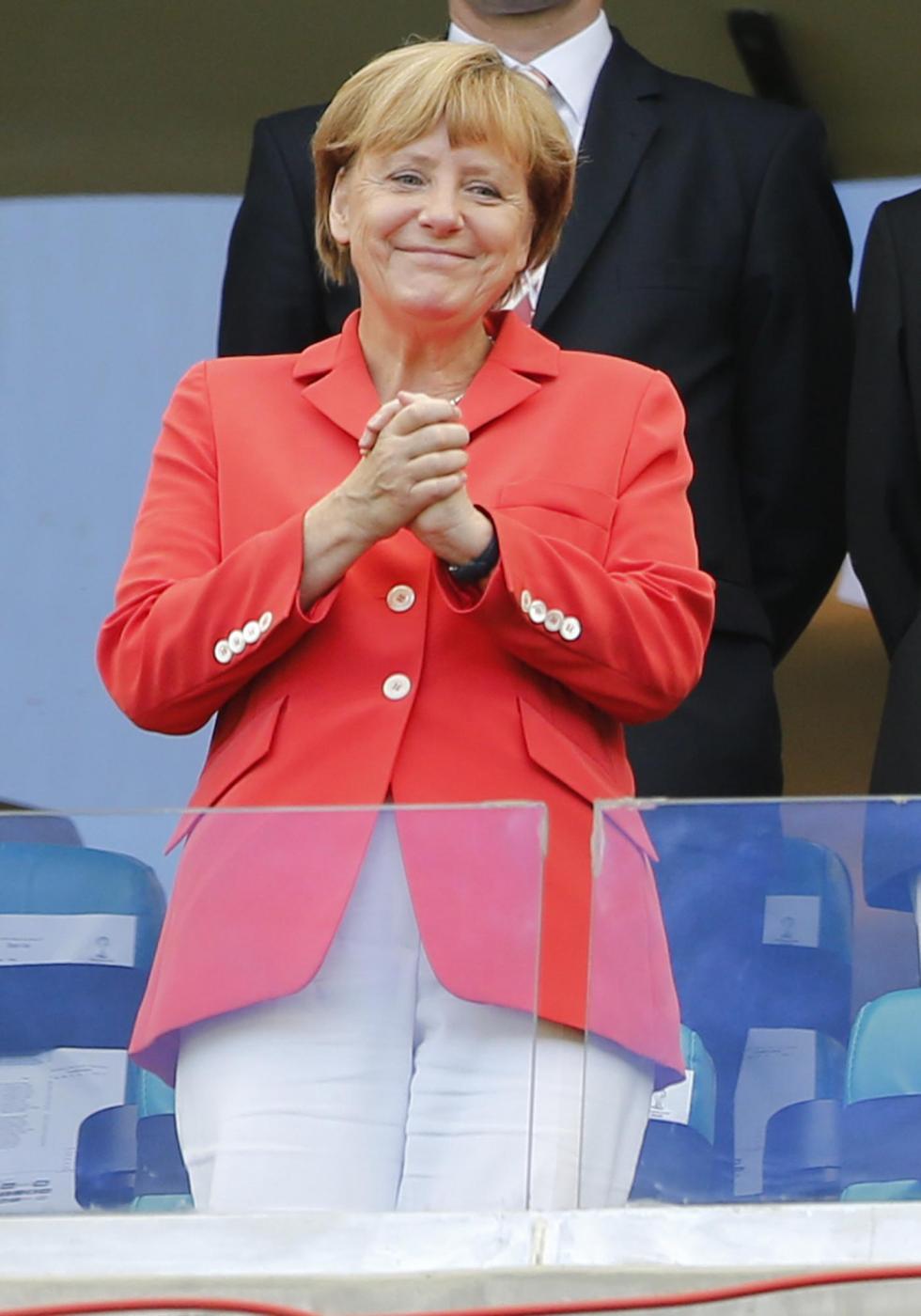 La cancelliera tedesca Angela Merkel ha invece un look semplice e sobrio: classica giacca con i risvolti. I colori vanno dal verde pisello al blu notte, all’azzurro, al giallo acido. Sotto di esse indossa generalmente pantaloni comodi e scarpe basse. Più o meno lo schema è sempre lo stesso, eppure la sua collezione di giacche sembra infinita, al punto che il graphic designer olandese Noortje van Eekelen si è impegnato a metterle tutte insieme, ordinandole secondo una precisissima scala cromatica che va dal blu al rosso. A differenza di Kirchner, Merkel sarà presente al Maracanà.