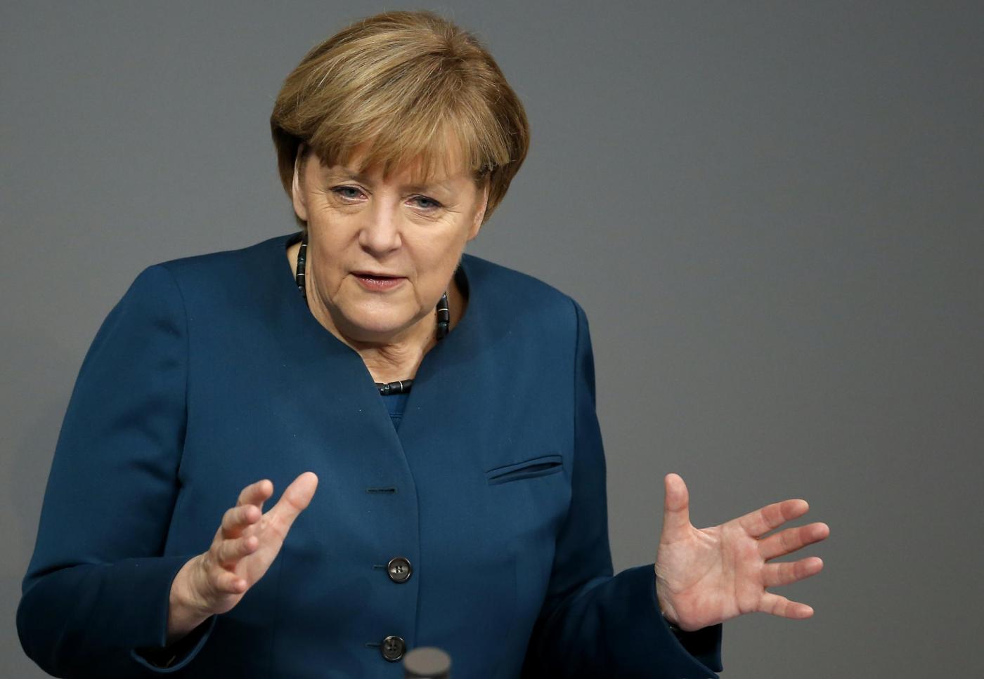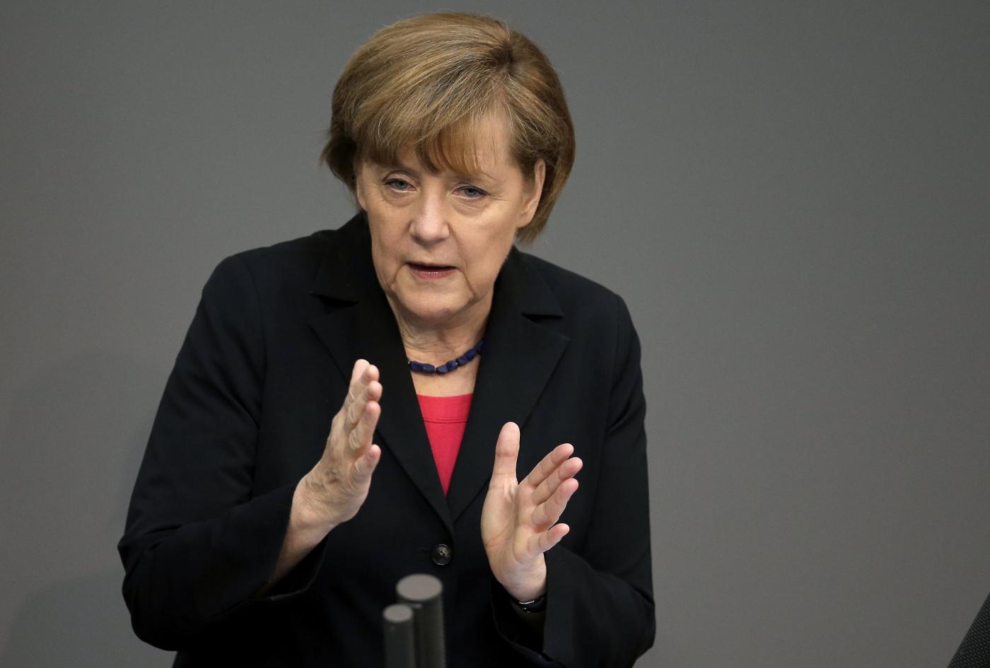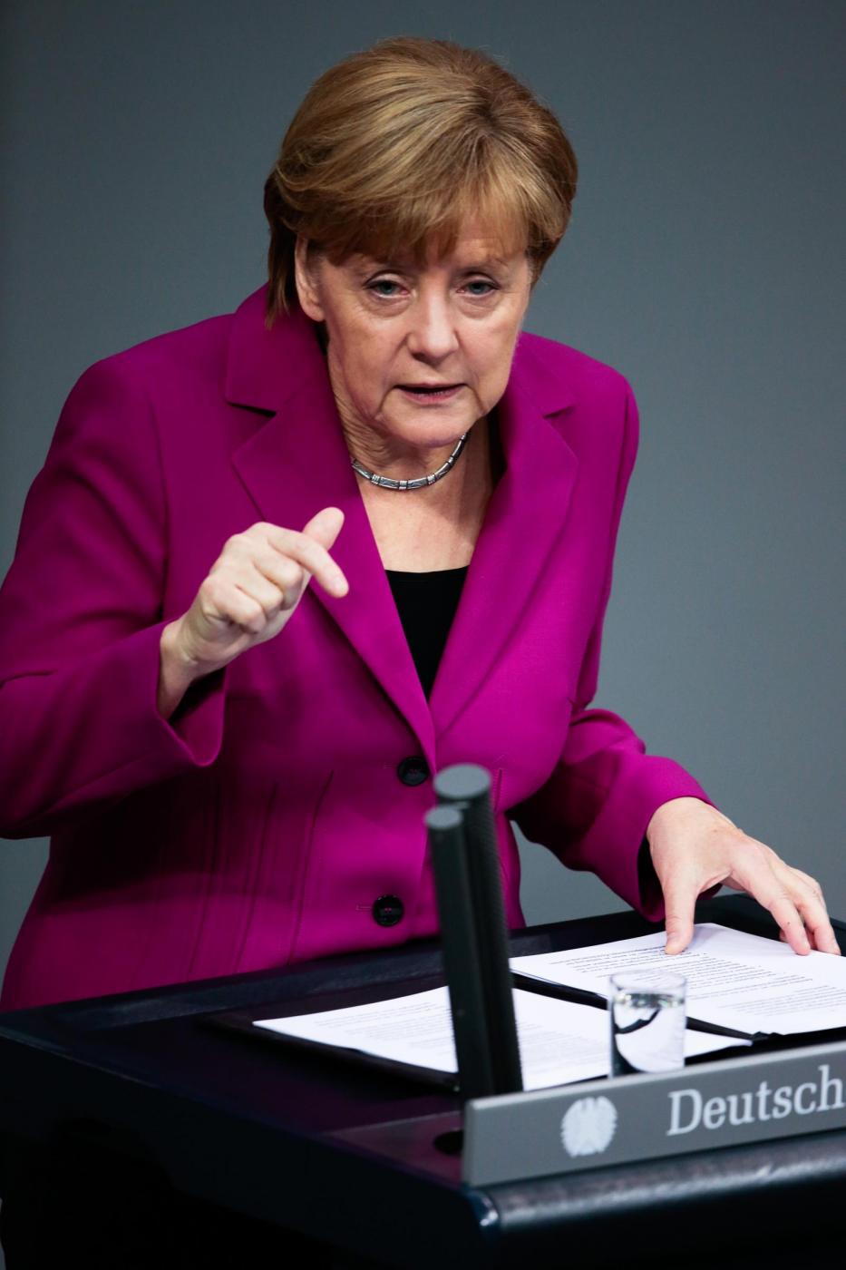 German Chancellor Angela Merkel gestures during her speech as part of a federal budget 2014 debate at the German federal parliament, Bundestag, in Berlin, Germany, Wednesday, April 9, 2014. (AP Photo/Michael Sohn)