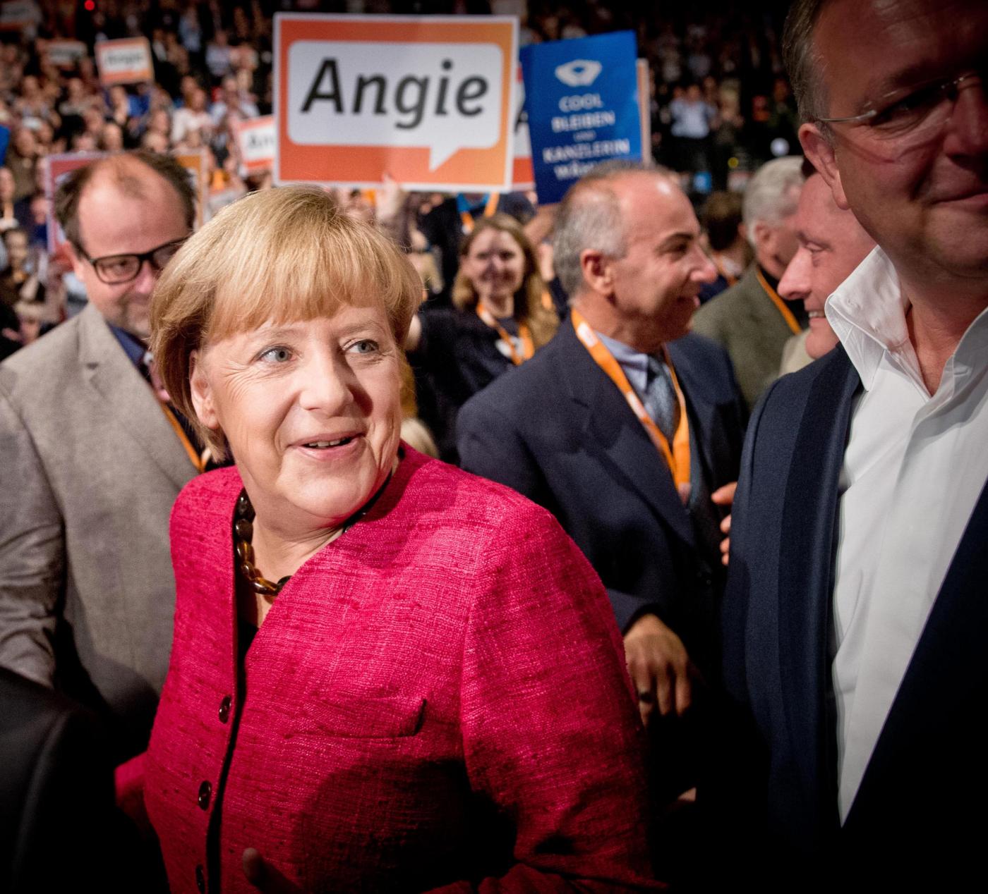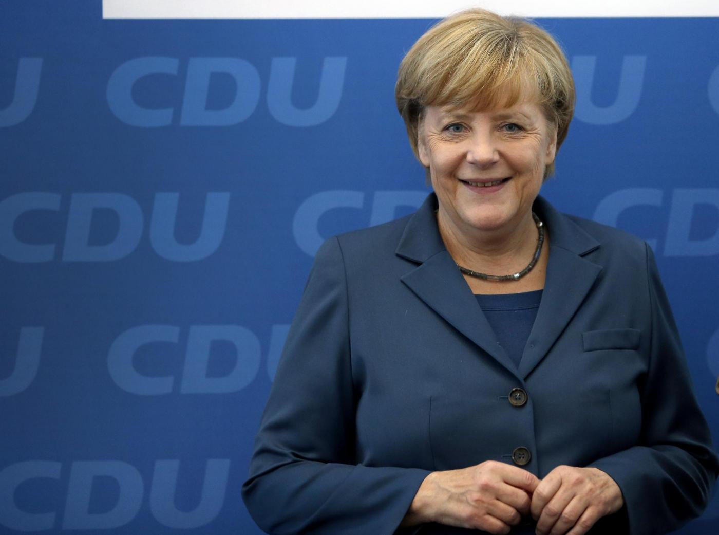 German Chancellor and chairwoman of the German Democratic Union party (CDU), Angela Merkel, smiles as she arrives for a party's board meeting in Berlin, Germany, Monday, Sept. 16, 2013. (AP Photo/Michael Sohn)
