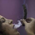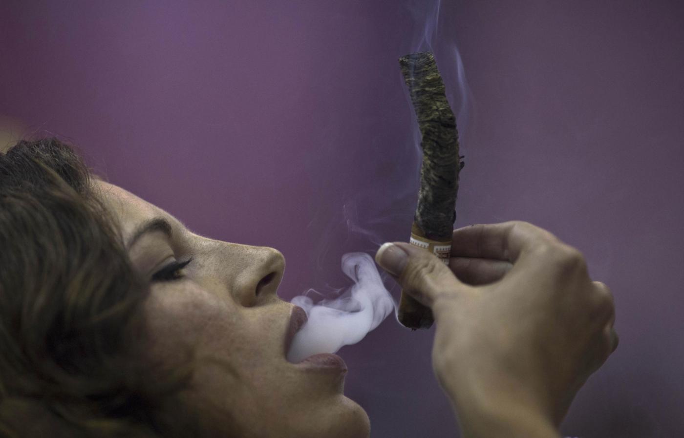 Olivia Terri smokes a cigar during the competition for the longest ash in Havana, Cuba, Thursday, Feb. 27, 2014. Cigar enthusiasts from around the world come to Cuba during the annual Cigar Festival to visit tobacco farms and factories and savor new cigar brands. (AP Photo/Ramon Espinosa)