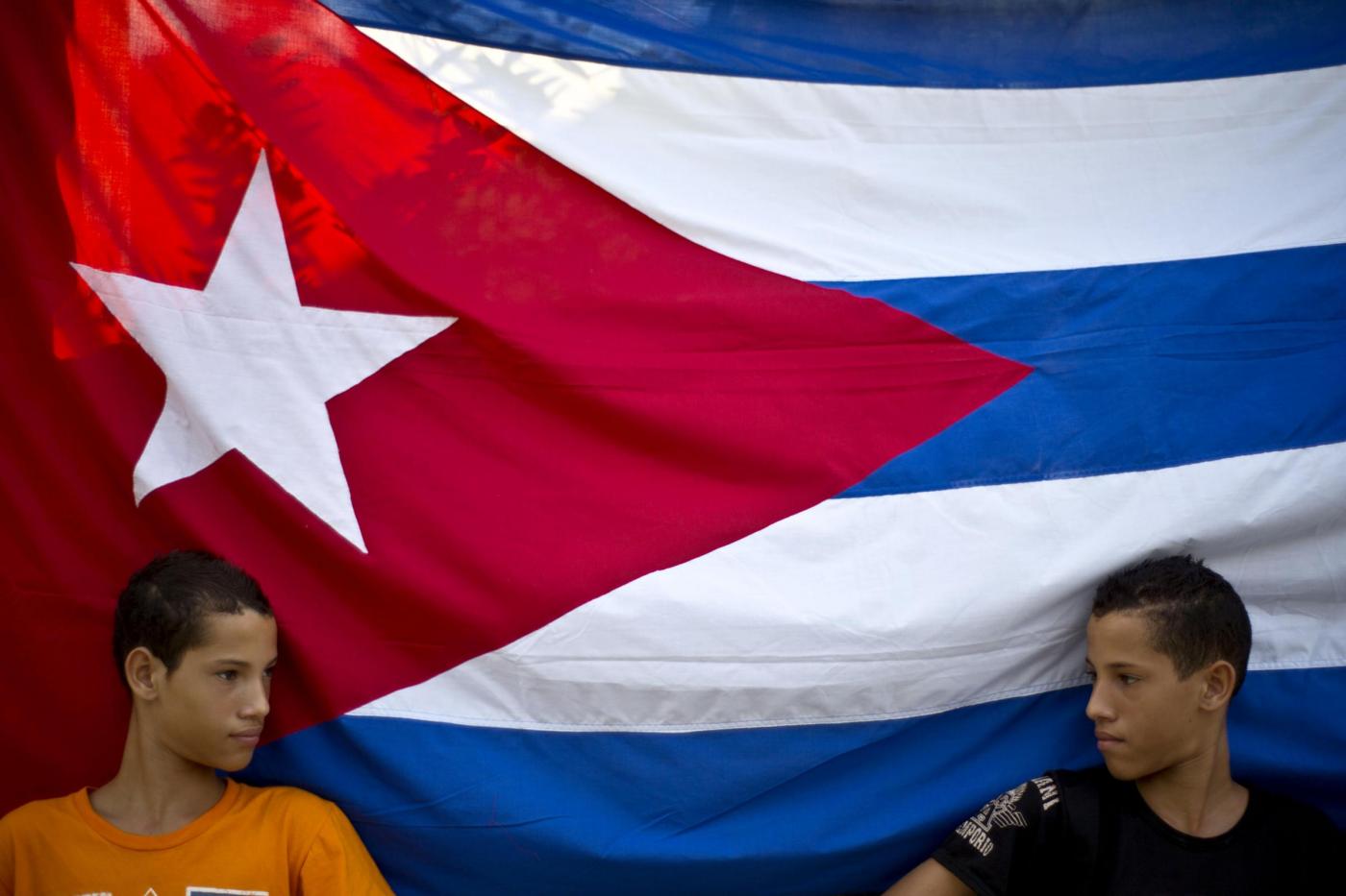 In this Sept. 29, 2013 photo, 15-year-old twins Damian and Cosme Depersi pose for portraits in front a Cuban flag along their street in Havana, Cuba. The Depersi brothers are just one set of twins, out of 12 sets, living along two consecutive blocks in western Havana. (AP Photo/Ramon Espinosa)