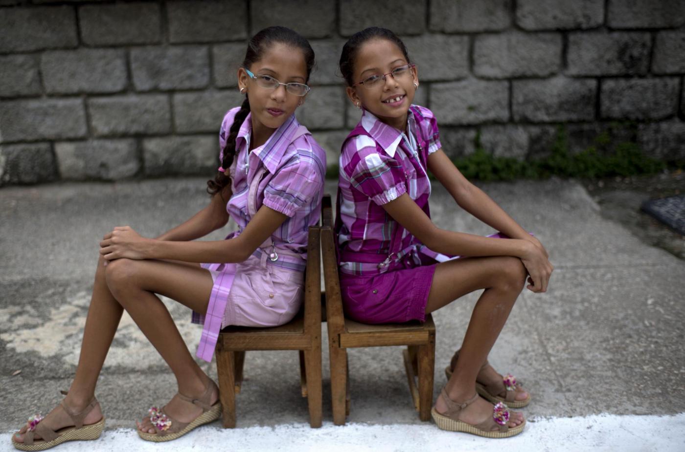 In this Sept. 29, 2013 photo, nine-year-old twin sisters Camila, left, and Carla Rodriguez pose for a portrait along their street in Havana, Cuba. 12 sets of twins live along two consecutive blocks in western Havana, ranging in age from newborns to senior citizens. "We love living on this block because we have twin friends," said Carla. (AP Photo/Ramon Espinosa)
