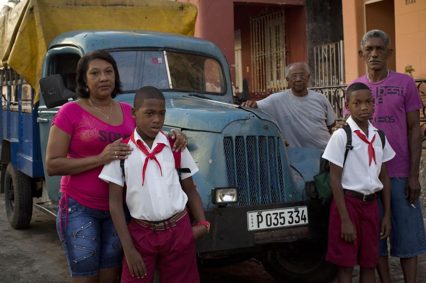 In this Sept. 23, 2013 photo, 11-year-old twin brothers Arian and Adrian Cueto pose for portraits in their school uniforms alongside their parents and grandfather as they gather around their family's truck in Havana, Cuba. The Cueto twins are one of 12 sets of twins living along two consecutive blocks in western Havana, ranging in age from newborns to senior citizens. (AP Photo/Ramon Espinosa)