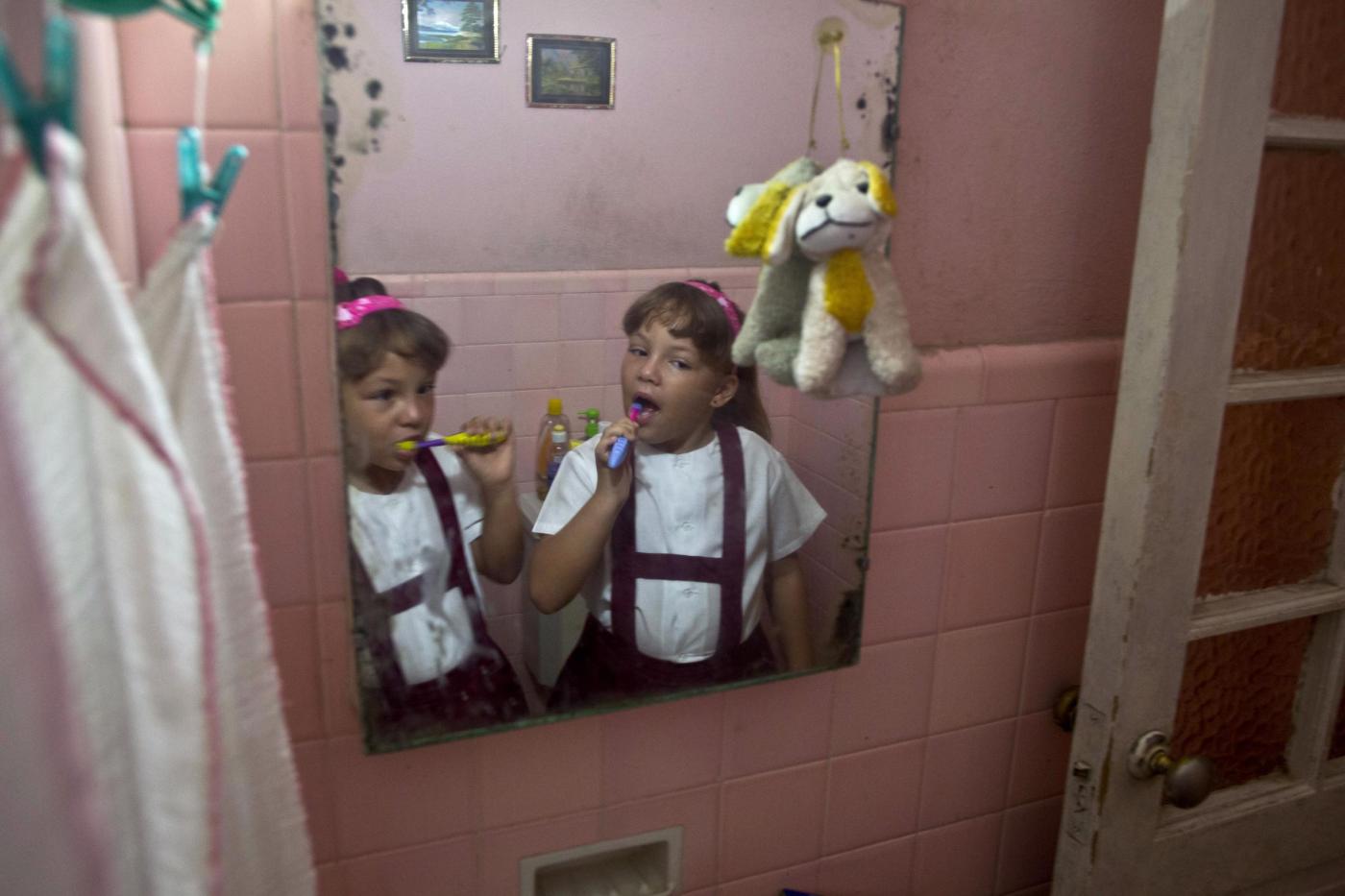 In this Sept. 23, 2013 photo, six-year-old twins Asley and Aslen Velazquez get ready for school in Havana, Cuba. Their mother Tamara said she never expected to have twins from her first pregnancy and did not take fertility treatments. "It's a lot of work. It requires a lot of patience," Velazquez said. "They are very active and dominant, although each has a different character." (AP Photo/Ramon Espinosa)