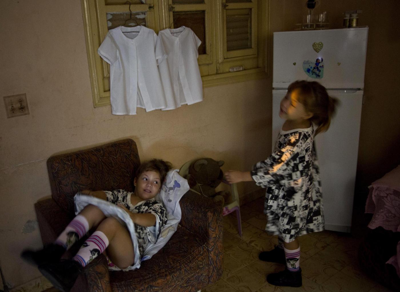 In this Sept. 23, 2013 photo, six-year-old twin sisters Asley and Aslen Velazquez prepare for school in Havana, Cuba. Their mother Tamara Velazquez said she never expected to have twins from her first pregnancy and did not take fertility treatments. "It's a lot of work. It requires a lot of patience," Velazquez said. "They are very active and dominant, although each has a different character." (AP Photo/Ramon Espinosa)