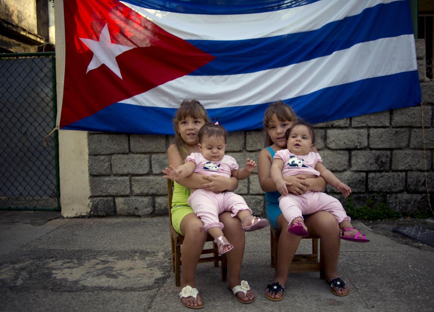 In this Sept. 29, 2013 photo, six-year-old twins Asley and Aslen Velazquez hold eight-month-old twins Tiffani and Stessany Valles as they pose for portraits in front a Cuban flag on their street in Havana, Cuba. While there's been no scholarly study of the 12 sets of twins on 68-A Street, they nonetheless consider themselves part of a special community. (AP Photo/Ramon Espinosa)