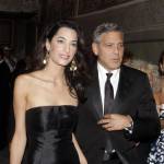 George Clooney and his fiancee Amal Alamuddin arrive for the "Celebrity Fight Night" foundation gala dinner, in Florence, Italy, Sunday, Sept. 7, 2014. (AP Photo/Francesco Bellini)