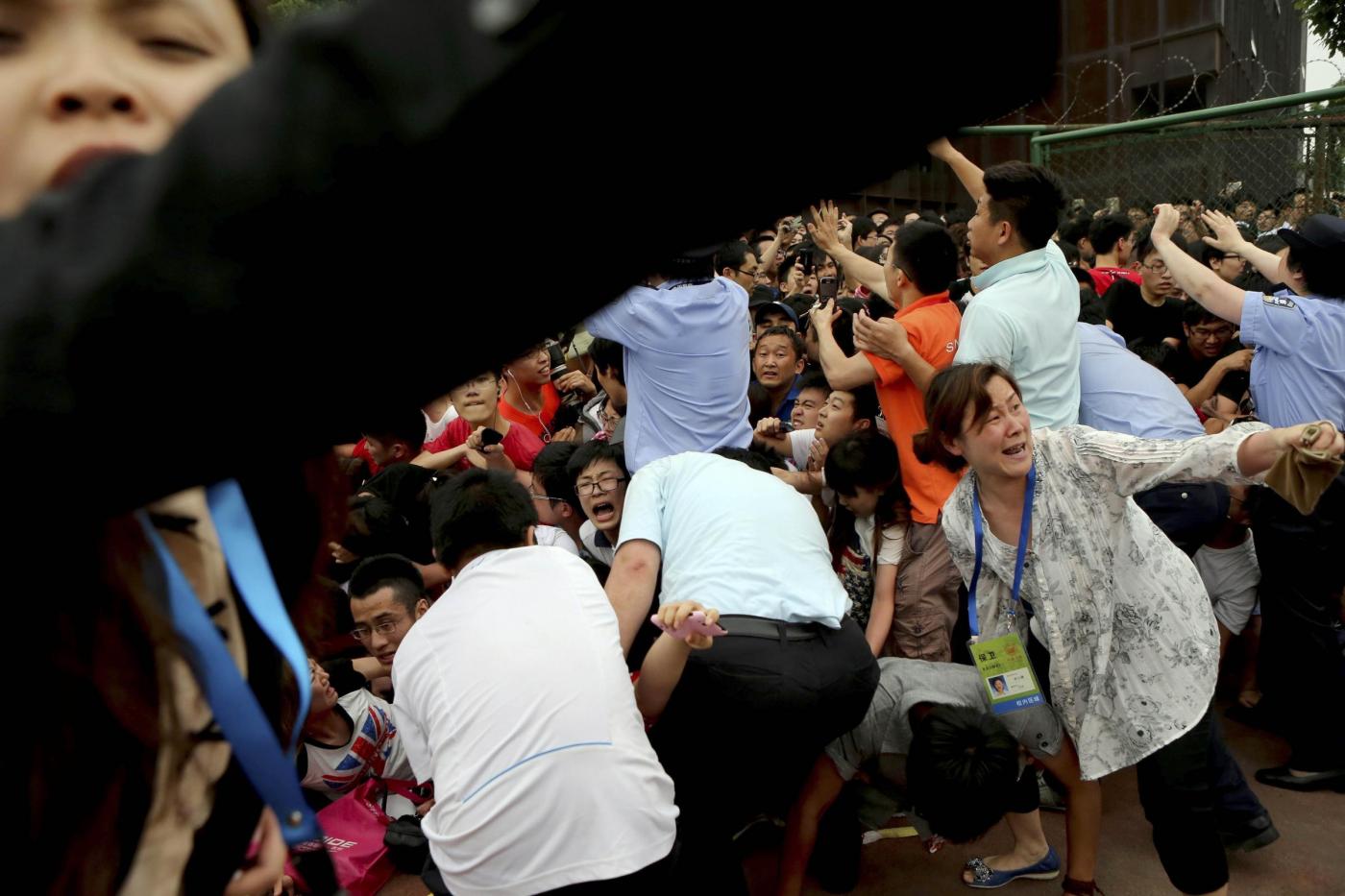 A crowd reacts during a stampede by fans of David Beckham at a university in Shanghai on Thursday, June 20, 2013. Fans eager to the see the soccer superstar stormed a police cordon Thursday in a stampede at a Shanghai university that injured seven people including five security personnel. (AP Photo) CHINA OUT