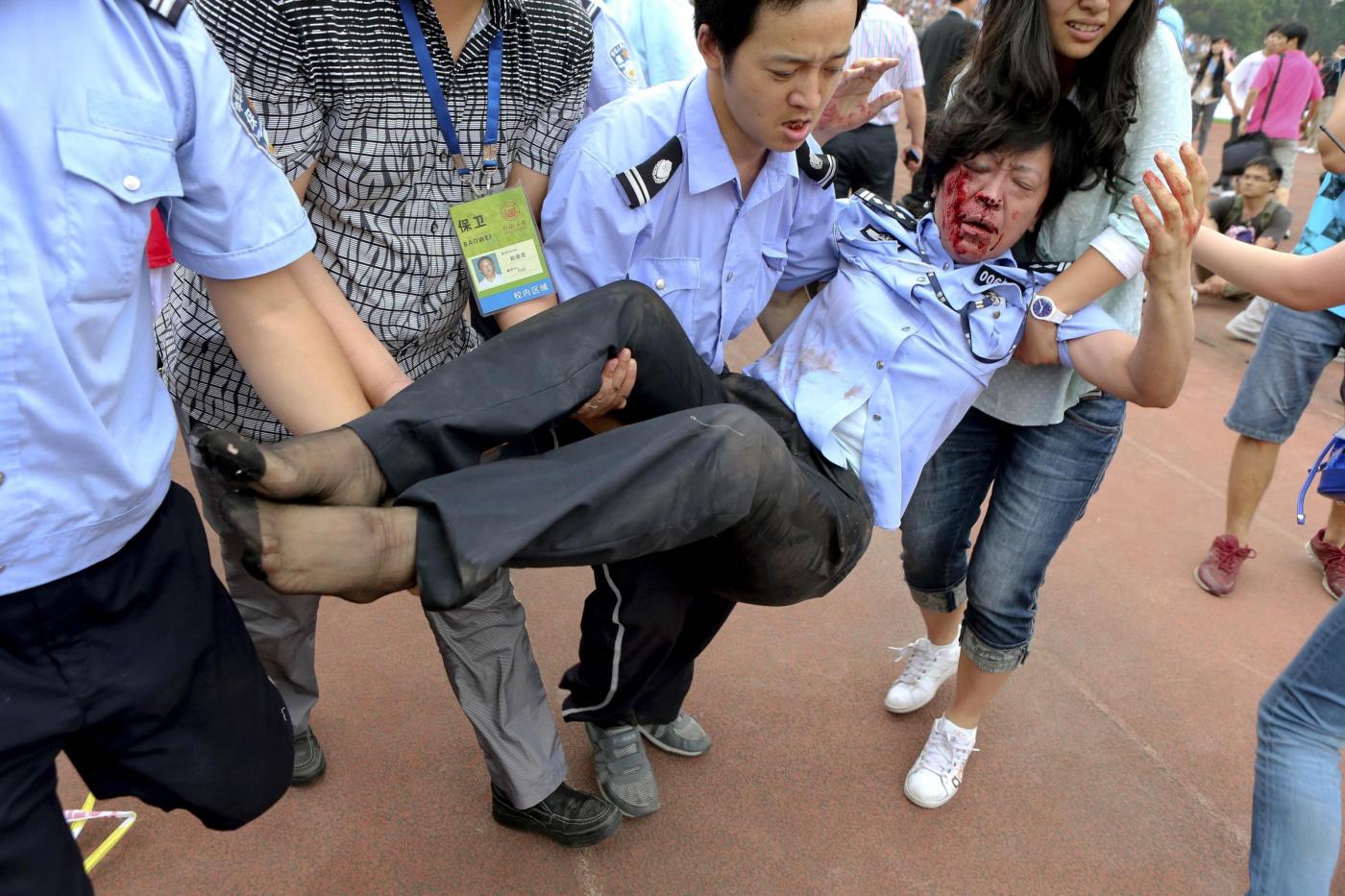 A security officer and others attempt to carry a policewoman injured in a stampede by fans of David Beckham at a university in Shanghai on Thursday, June 20, 2013. Fans eager to see the soccer superstar stormed a police cordon Thursday in a stampede at a Shanghai university that injured seven people including five security personnel. (AP Photo) CHINA OUT