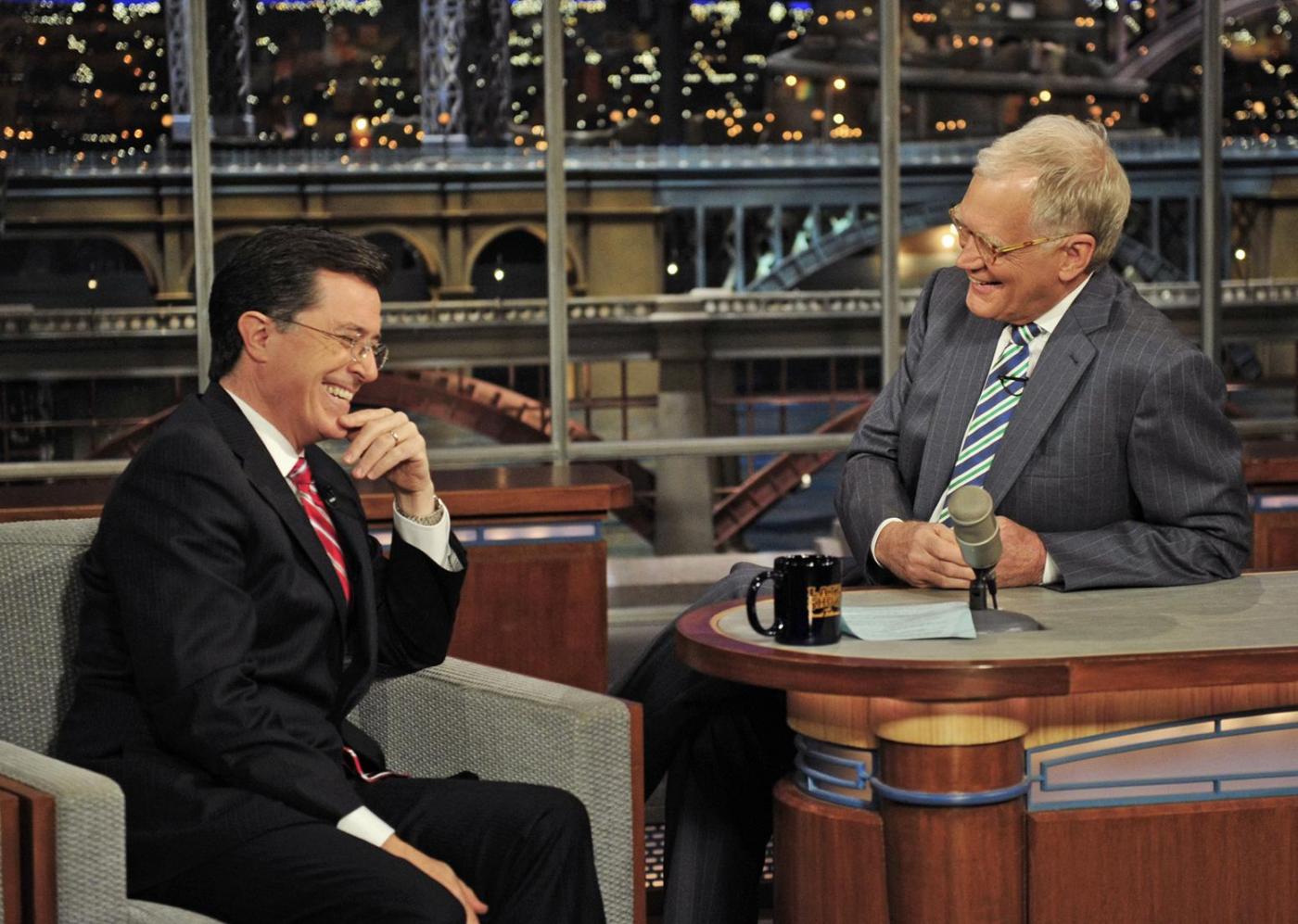 In this May 3, 2012 photo provided by CBS, Stephen Colbert, left, host of the “Colbert Report” on the Comedy Central Network, has a laugh on stage with host David Letterman on the set of the “Late Show with David Letterman,” in New York. CBS announced on Thursday, April 10, 2014 that Colbert will replace Letterman as “Late Show” host after Letterman retires in 2015. (AP Photo/CBS, John Paul Filo) MANDATORY CREDIT, NO SALES, NO ARCHIVE, FOR NORTH AMERICAN USE ONLY