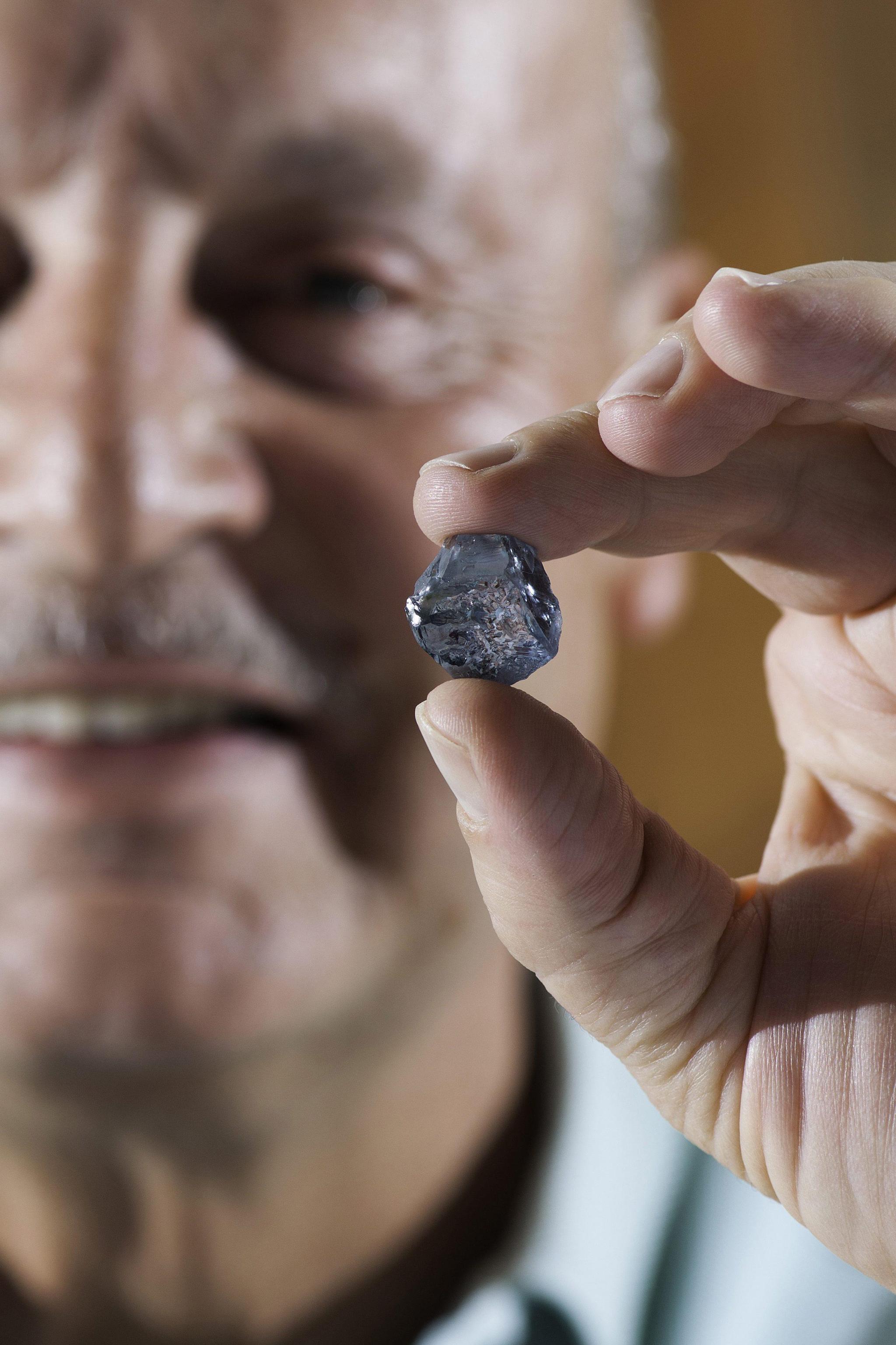 epa04035757 A handout photograph made available by Petra Diamonds Limited on 22 January 2014 showing the CEO Johan Dippenaar of Petra Diamonds holding the Cullinan 29,6 carat Blue Diamond. The companty report that 29.6 carat blue diamond recovered at the Cullinan mine, north-east of Pretoria, South Africa in January 2014. The stone is an outstanding vivid blue with extraordinary saturation, tone and clarity, and has the potential to yield a polished stone of great value and importance. Blue diamonds are among the rarest and most highly coveted of all diamonds and the Cullinan mine is the most important source of blues in the world. This stone is one of the most exceptional stones recovered at Cullinan during Petra's operation of the mine. EPA/PHILIP MOSERT / PETRA DIAMONDS LTD / HANDOUT No HANDOUT EDITORIAL USE ONLY/NO SALES