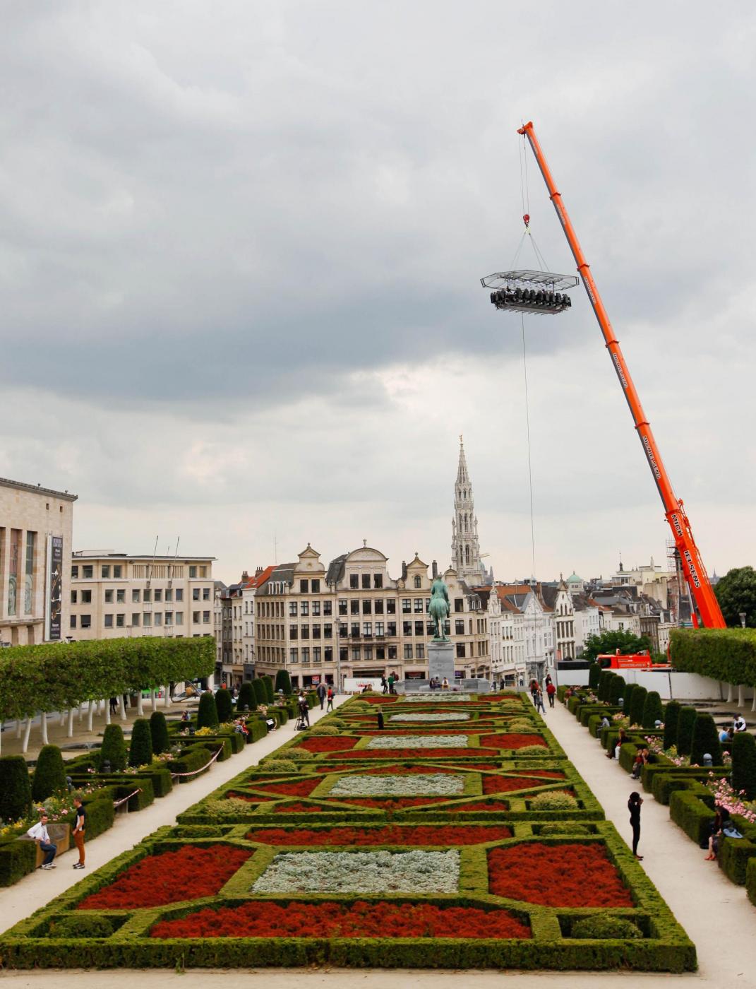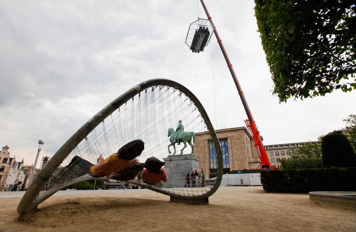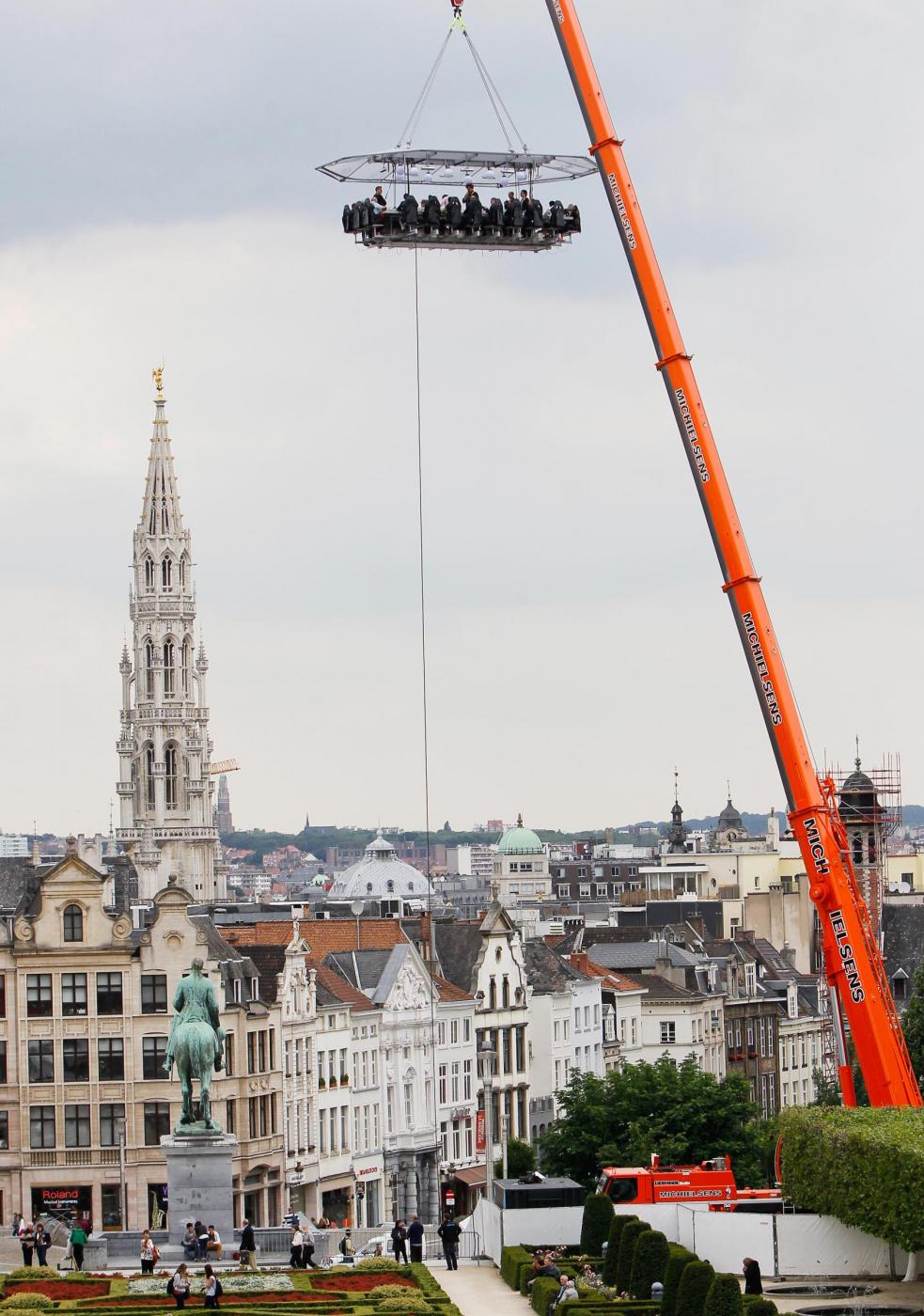 BRUSSELS, June 26, 2013 People take rest beneath the ''Dinner in the Sky'' on a hanging platform in Brussels, Belgium, June 26, 2013. ''Dinner in the Sky'' accommodates 22 guests, seated at a table suspended from a crane at the height of 45 meters.(Xinhua/Zhou Lei. LaPresseOnly Italy