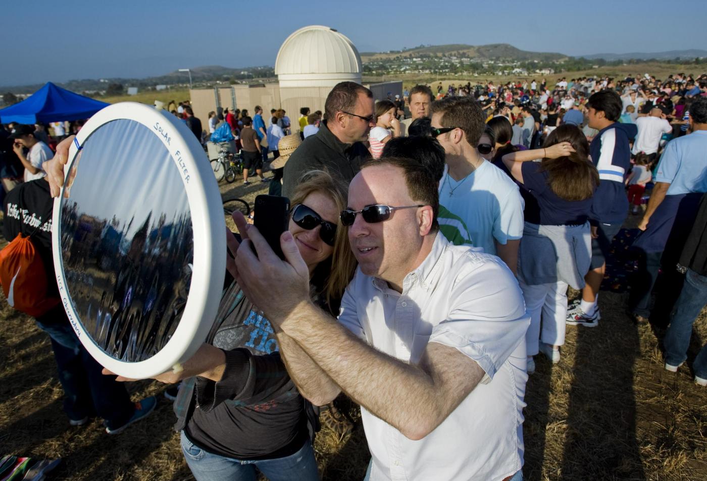May 20, 2012 - Irvine, California, U.S. - Gary Wilens, right, of Rancho Santa Margarita, takes a photo of the solar eclipse through a special filter at the UC Irvine Observatory in Irvine, Sunday evening. Hundreds gathered Sunday evening at the observatory for the event...../// ADDITIONAL INFORMATION: 5/20/12 - Mark Rightmire, The Orange County Register - eclipse - Photo by Mark Rightmire, The Orange County Register (Credit Image: © Mark Rightmire/The Orange County Register/ZUMAPRESS.com)