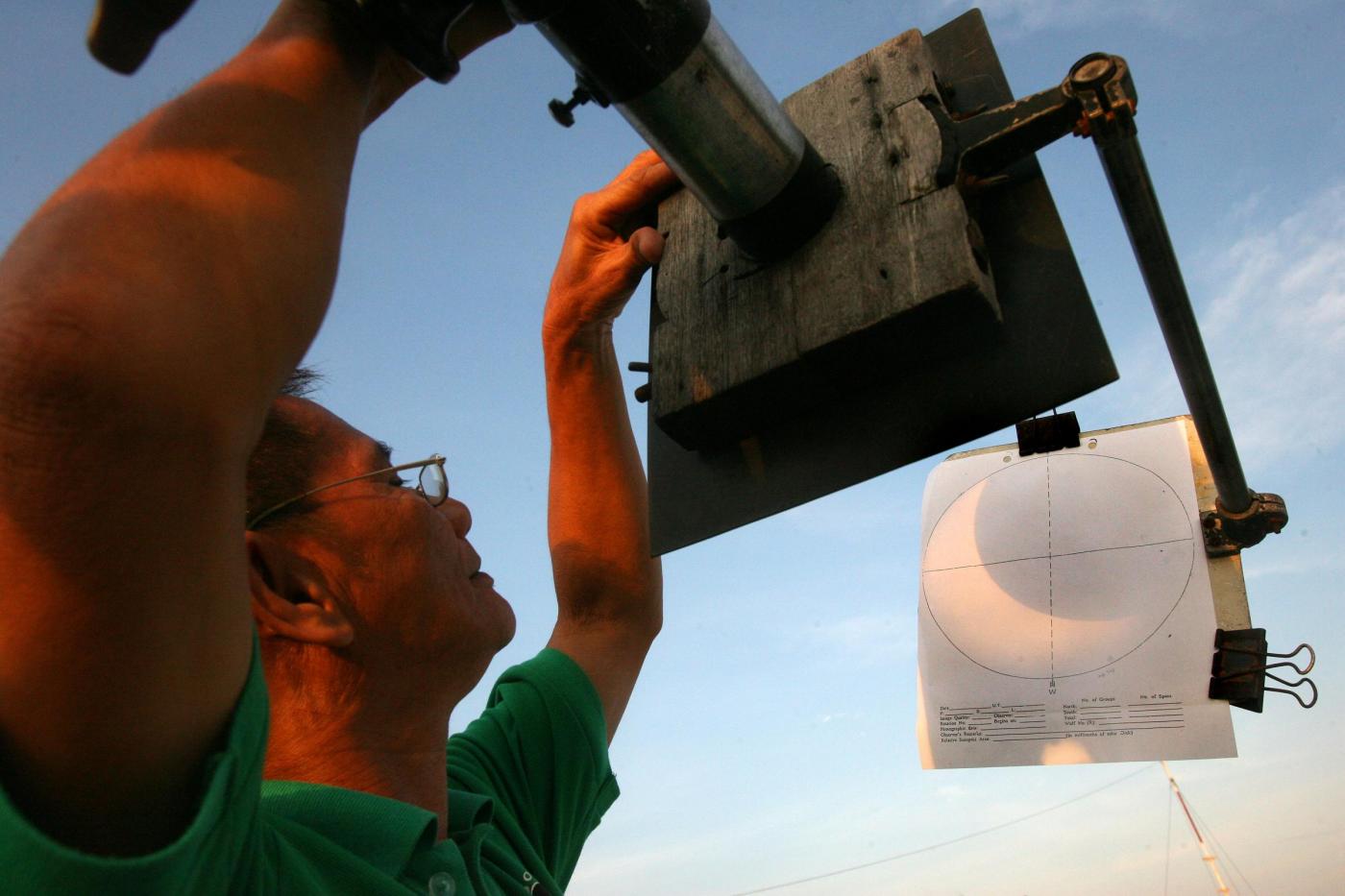 MANILA, May 21, 2012 An observer from the Department of Science and Technology looks and studies the pinhole projection of the annular solar eclipse at the University of the Philippines Observatory in Quezon City, the Philippines on May 21, 2012. The annular solar eclipse is seen in various areas in the country as the Moon partially blocks the Sun. (Credit Image: © Manila/Xinhua/ZUMAPRESS.com)