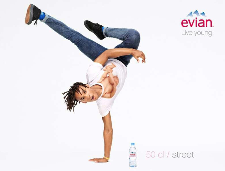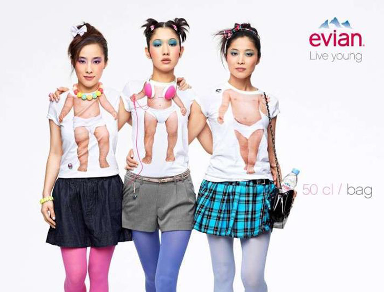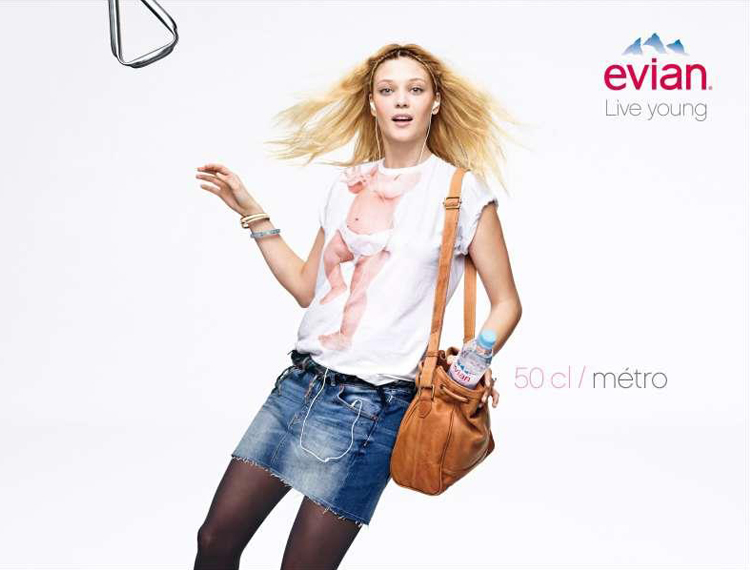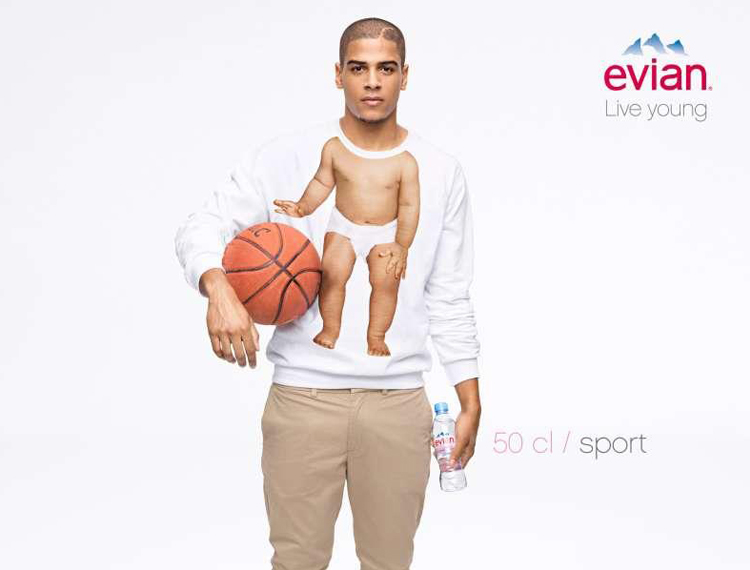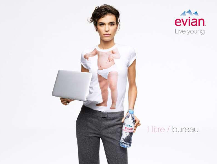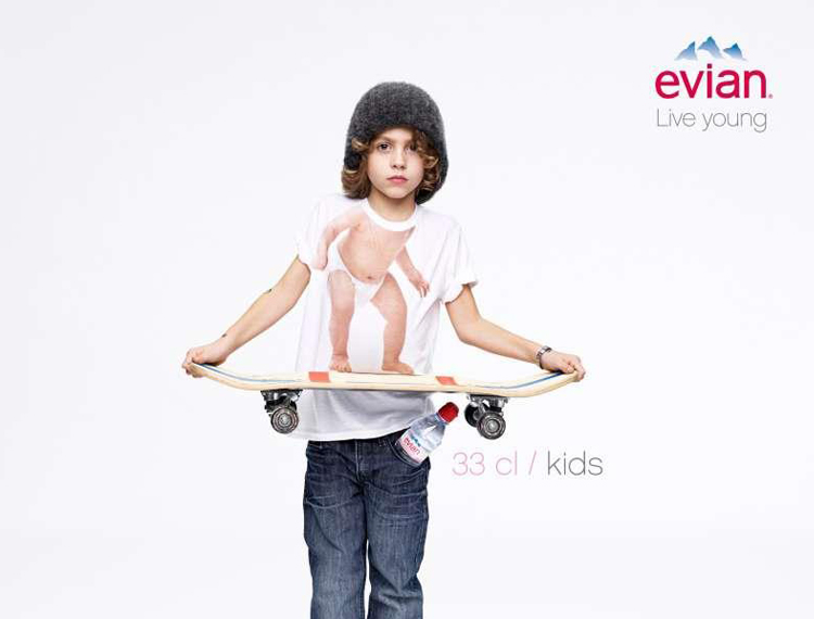 Ecco una nuova declinazione della campagna “live young” di Evian, uscita ieri 2 maggio in Francia. Il lavoro dell’agenzia di pubblicità BETC prevede le immagini di modelli adulti che usano T-shirt stampate con il corpo di un bèbè. L’occasione è il lancio delle nuove bottiglie formato piccolo. L’effetto è divertente.