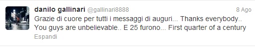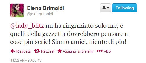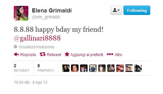 DENVER – Elena Grimaldi “cinguetta” gli auguri a Danilo Gallinari. Danilo Gallinari “cinguetta” il grazie a Elena Grimaldi. Tutto su Twitter, ma sono anche gli unici auguri a cui Gallinari ha risposto personalmente. Almeno così scrive il sito de la Gazzetta dello Sport. Lei però smentisce qualsiasi malignità sul nascere: “Siamo solo amici”.