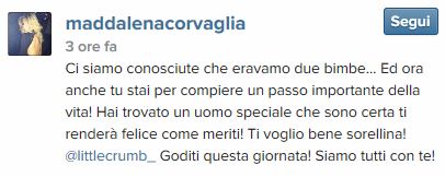 “Ci siamo conosciute che eravamo due bimbe – scrive Maddalena – Ed ora anche tu stai per compiere un passo importante della vita! Hai trovato un uomo speciale che sono certa ti renderà felice come meriti! Ti voglio bene sorellina! @littlecrumb_ Goditi questa giornata! Siamo tutti con te!”
