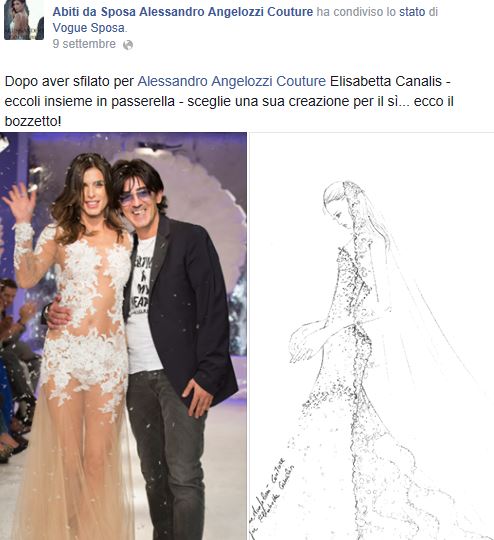 Lo stilista che ha creato il vestito di Elisabetta è Alessandro Angelozzi. L’abito, rigorosamente bianco, è stato realizzato in Abruzzo, nell’atelier del Borgo di Garrufo di Sant’Omero. Seppur corteggiata da tante griffe, sottolinea una nota dell’ufficio stampa dello stilista, “Canalis ha privilegiato lo stile italiano, la semplicità, la cura dei dettagli e la tradizione”.