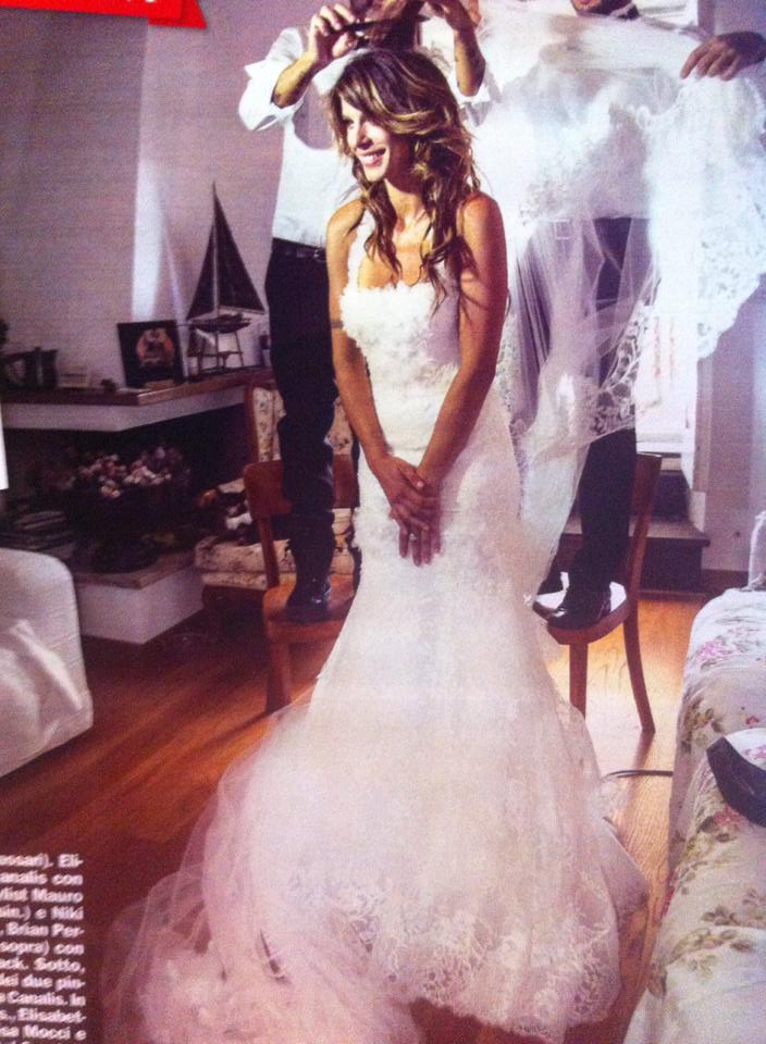 L’abito, a sirena e senza spalline, mette in risalto il corpo tonico di Elisabetta. Tutta un’altra storia rispetto alle prime foto circolate sul web, in cui quello immortalato non era certo l’abito della Canalis ma una semplice mantella per nasconderlo. Forse, per motivi di “diritti di foto”? Chissà…