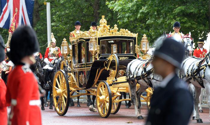 LONDRA – Elisabetta si presenta al tradizionale discorso per l’apertura dell’anno parlamentare a Westminster sulla nuova carrozza da parata detta del Giubileo di Diamante, costruita con alcuni reperti unici della storia britannica. Fra questi i frammenti della Mary Rose, la nave da guerra di Enrico VIII, dell’albero di mele di Sir Isaac Newton, e parti dell’ammiraglia di Horatio Nelson, la Hms Victory. Sulla carrozza, che pesa tre tonnellate ed è trainata da sei cavalli, domina una corona di legno ornata con foglie d’oro. E’ stata costruita in Australia ed è la seconda realizzata negli ultimi cento anni.