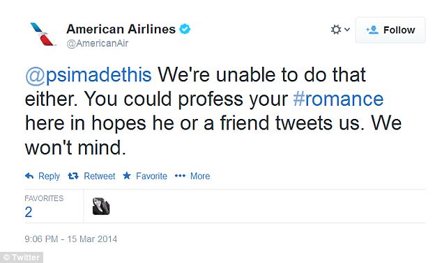 “La Domesek ha immediatamente contattato su Twitter la American Airlines postando diversi messaggi in cui raccontava in breve la storia dell’incontro sul velivolo e in cui chiedeva aiuto. La compagnia aerea ha risposto sul sito di microblogging augurando alla ragazza buona fortuna, ma sottolineando che per una questione di privacy non poteva girarle le generalità dei passeggeri. La Domesek non si è scoraggiata e ha ritwittato parafrasando una battuta del film “Notting Hill”: ‘Sono solo una ragazza, che sta difronte al mondo e chiede a una compagnia aerea di aiutarla’”
