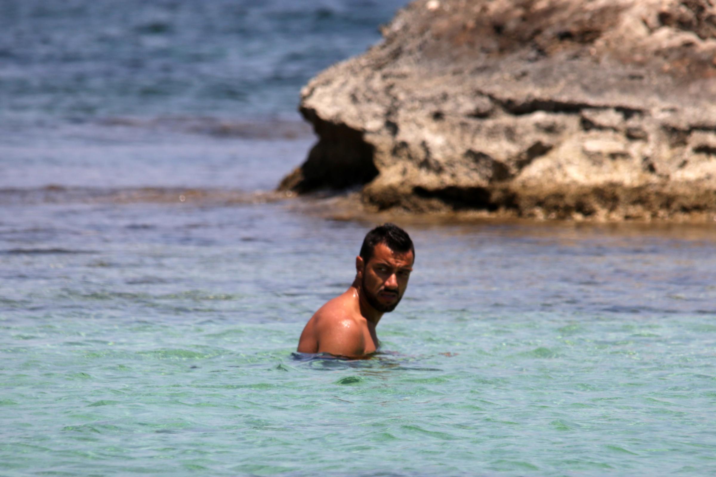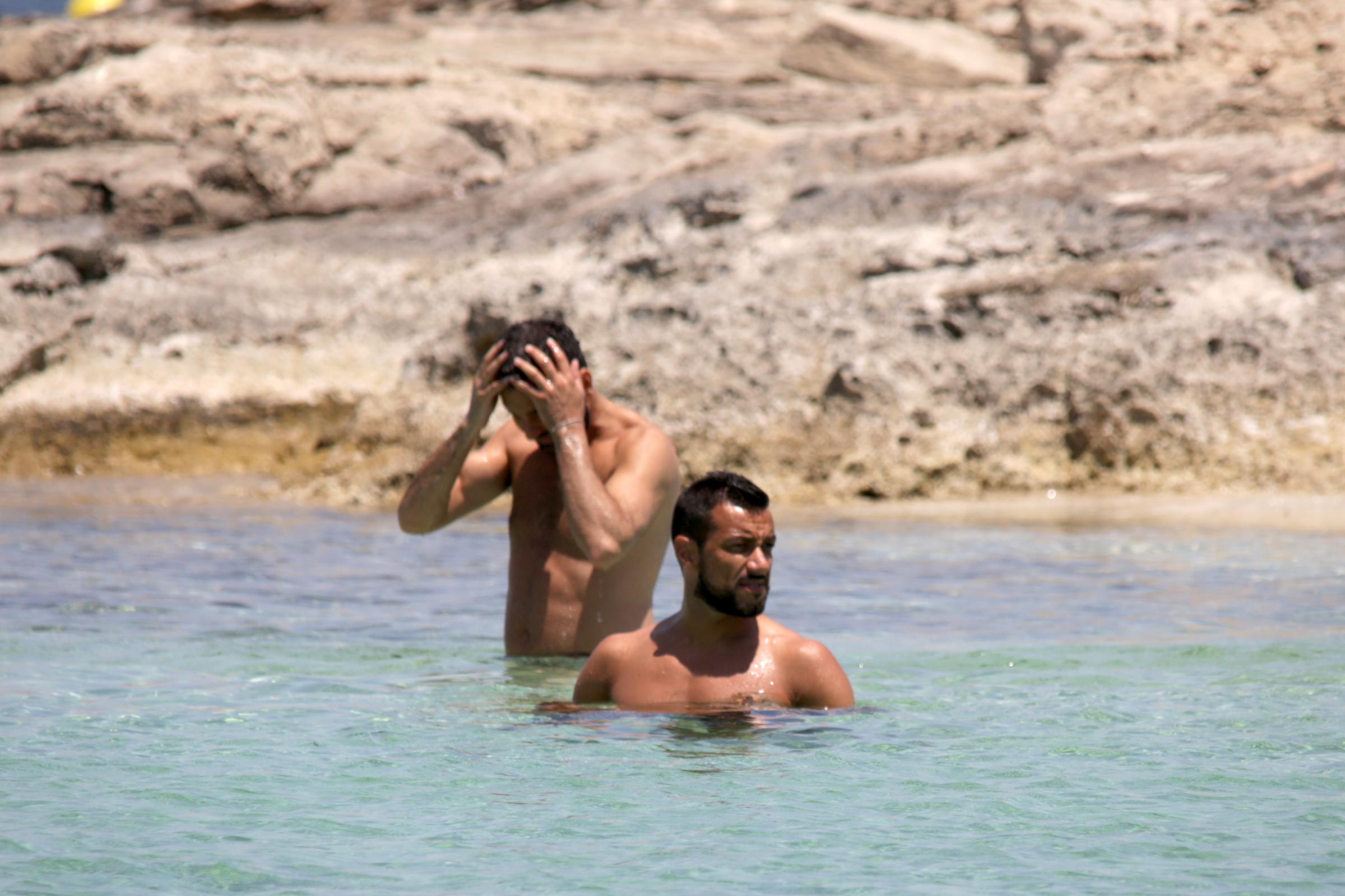 L’attaccante juventino si gode l’acqua cristallina fra sole, chiacchierate e nuotate al largo. Per lui sulla spiaggia look essenziale: un costume scuro a pantaloncino e nient’altro. Il resto lo fanno i muscoli.