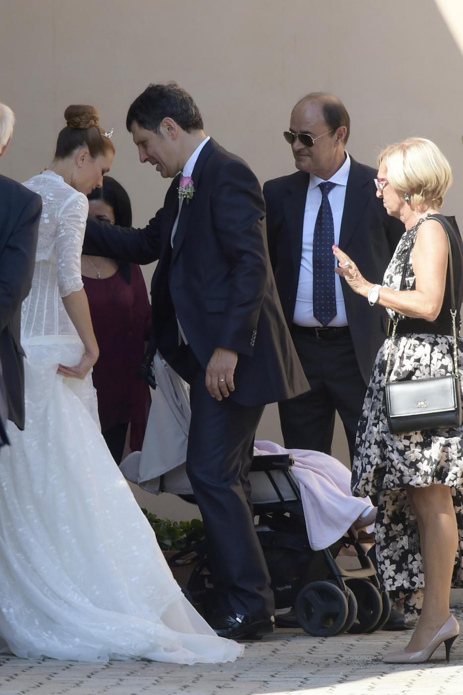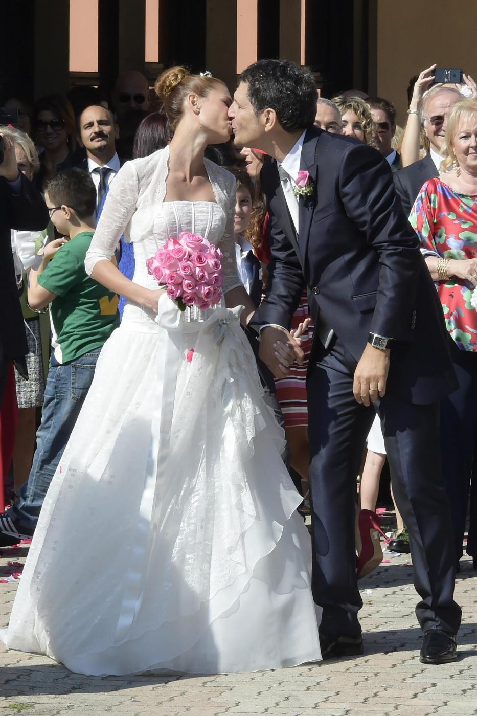 La sposa ha scelto per la cerimonia un abito tradizionale bianco lungo fino ai piedi, rafforzato in vita da un bustier, abbinato a un coprispalle di pizzo. Niente velo, ma capelli raccolti in un chignon alto cinto da una treccia e impreziosito da un piccola diadema che illuminava il viso. Il noto conduttore Rai, per il grande giorno ha indossato invece un completo scuro con un gilet grigio argento in tono con la cravatta e una rosellina rosa sulla giacca che richiamava il piccolo bouquet di rose della sposa.
