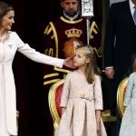 Spain's Queen Letizia, left, talks to her daughter Princess Leonor, center, next to her other daughter Princess Sofia during a ceremony where his husband Spain's newly crowned King Felipe VI is sworn as the new Spanish King at the Spanish parliament in Madrid, Spain, Thursday, June 19, 2014. Felipe's father Juan Carlos, who reigned during four decades, stepped down after signing an abdication law Wednesday so that younger royal blood can rally a country beset by economic problems, including an unemployment rate of 25 percent. (AP Photo/Paco Campos, Pool)