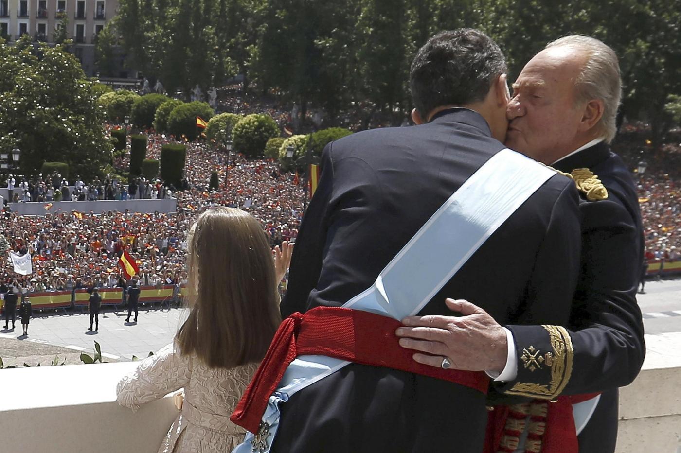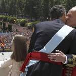 Spain’s King Juan Carlos, right, kisses his son, the newly crowned King Felipe VI on the balcony of the Royal Palace in Madrid, Spain, on Thursday, June 19, 2014. Spain's new King Felipe VI was proclaimed monarch at a formal ceremony in the country's Parliament on Thursday, a deliberately low-key occasion for austere times and tarnished royal reputations. (AP Photo/Javier Lizon, Pool)