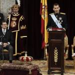 Spain's newly crowned King Felipe VI gives his speech, next to his wife Spain's Queen Letizia during the swearing in ceremony at the Spanish parliament in Madrid, Spain, Thursday, June 19, 2014. Felipe's father Juan Carlos, who reigned during four decades, stepped down after signing an abdication law Wednesday so that younger royal blood can rally a country beset by economic problems, including an unemployment rate of 25 percent. (AP Photo/Paco Campos, Pool)