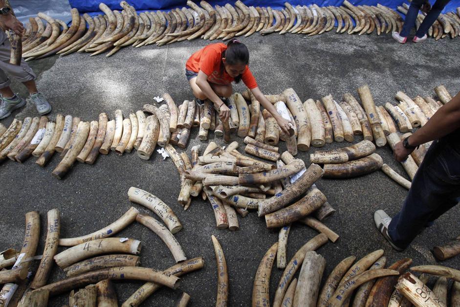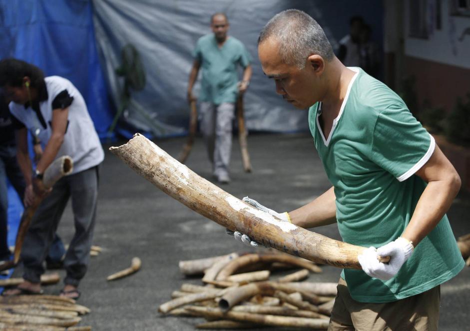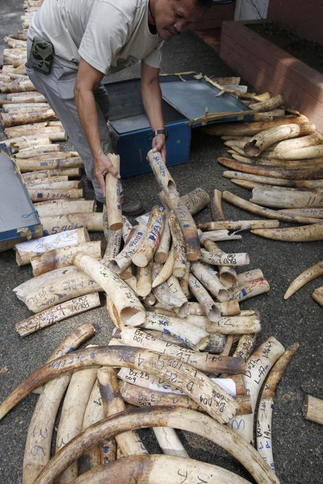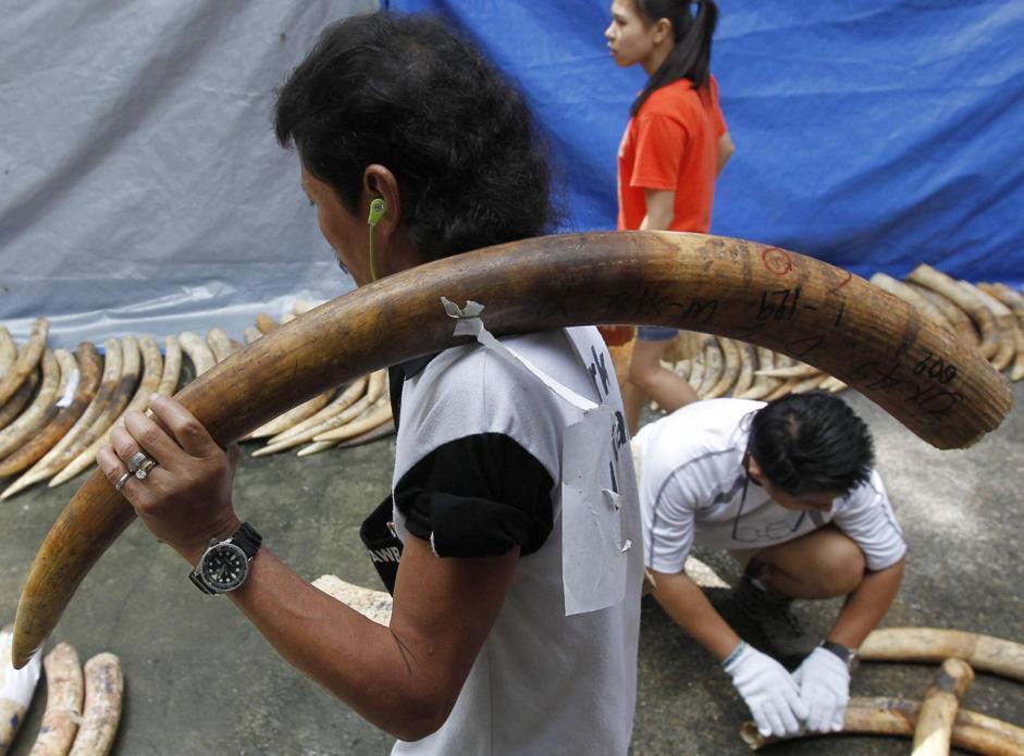 epa03748381 A Filipino staff arranges elephant tusks that have been seized from illegal shipments since 2009 and are kept in storage at the Protected Areas and Wildlife Bureau-Department of Environment and Natural Resources (PAWB-DENR) in Quezon City, east of Manila, Philippines, 17 June 2013. The DENR is set to destroy by crushing close to five tons of seized elephant tusks worth some 420-million pesos (7.3-million euro) on 21 June to support global campaigns against illegal trade of wildlife, local media reports stated. EPA/ROLEX DELA PENA