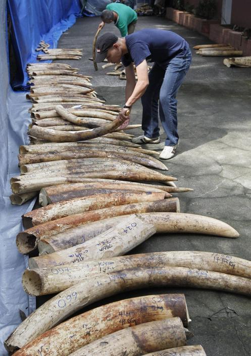 epa03748379 A Filipino staff arranges elephant tusks that have been seized from illegal shipments since 2009 and are kept in storage at the Protected Areas and Wildlife Bureau-Department of Environment and Natural Resources (PAWB-DENR) in Quezon City, east of Manila, Philippines 17 June 2013. The DENR is set to destroy by crushing close to five tons of seized elephant tusks worth some 420-million pesos (7.3-million euro) on 21 June to support global campaigns against illegal trade of wildlife, local media reports stated. EPA/ROLEX DELA PENA