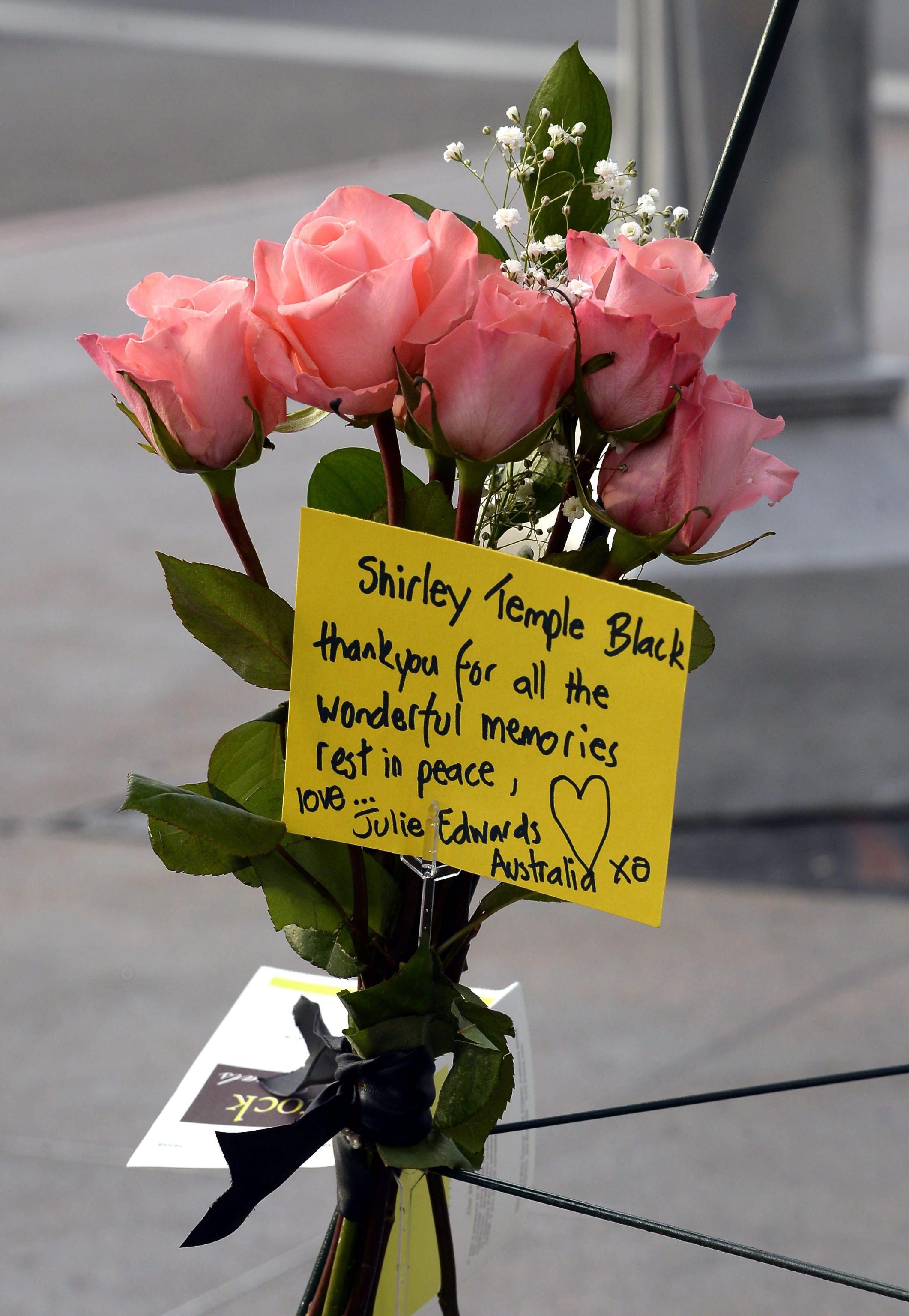 epa04070657 Flowers are placed at the Gateway to Hollywood on the Hollywood Walk of Fame in Hollywood, California, USA, 11 February 2014 for US actress and diplomat Shirley Temple Black who died in San Francisco on 10 February 2014 at the age of 85. EPA/MICHAEL NELSON