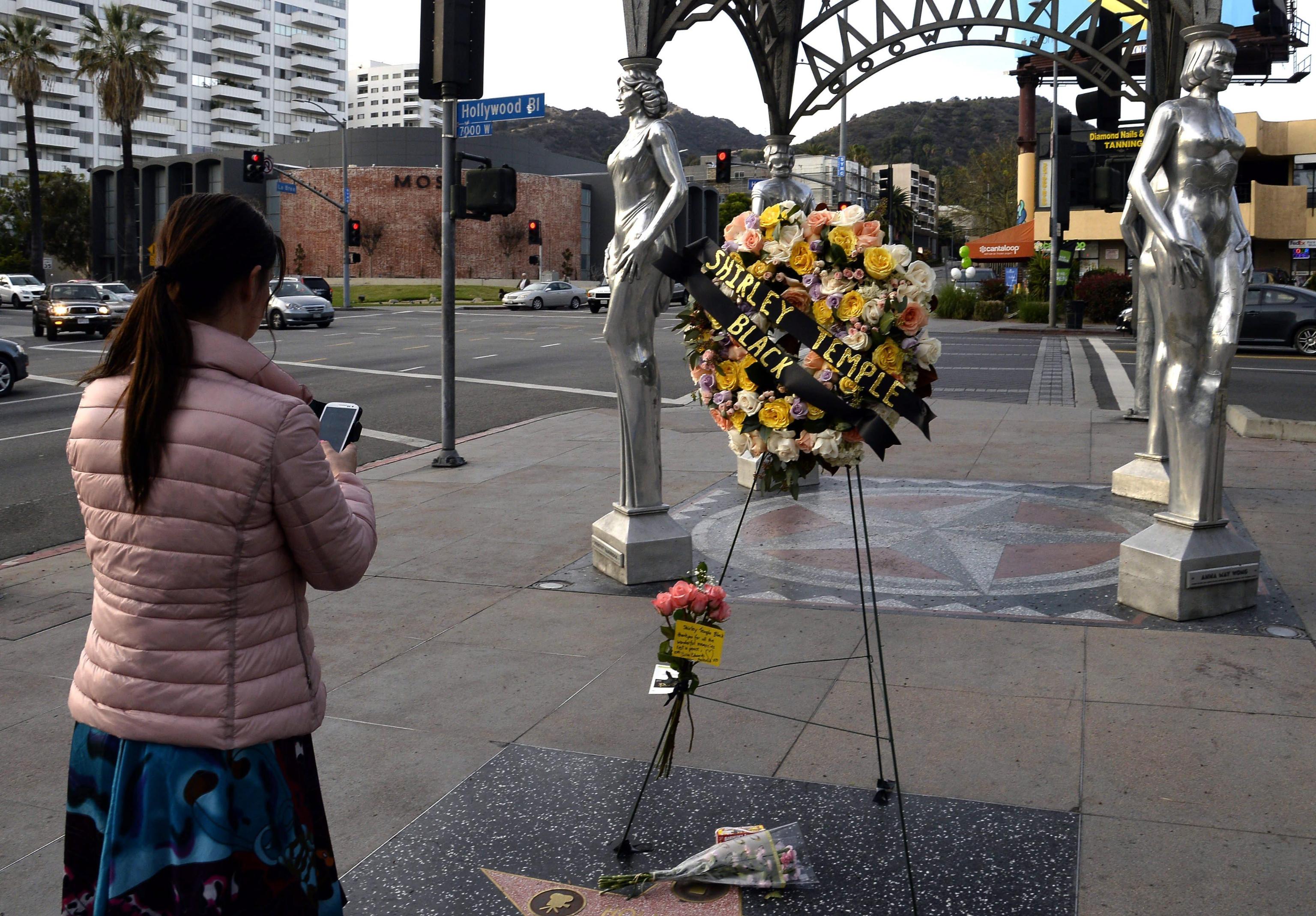 epa04070656 A visitor from Holland takes a picture of a memorial set up for the late actress and diplomat Shirley Temple Black on the Hollywood Walk of Fame in Hollywood, California, USA, 11 February 2014. The US actress and diplomat Shirley Temple Black died in San Francisco on 10 February 2014 at the age of 85. EPA/MICHAEL NELSON